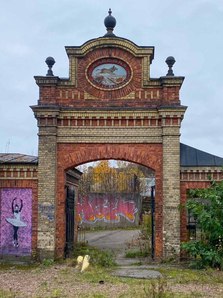 I flera år har vi pratat om att åka fram till Vargön och besöka ”Bruket Street Art”. Om detta besöksmål kan man bl a läsa om på websidan ”Udda utflykter” och det är väl just vad man kan kalla Bruket Street Art. Här låg från 1868 Wargöns Bruk, vilket runt kommande sekelskifte var ett av norra Europas största skogsindustriföretag och pappersbruk. Kl 13:46 den 15:e december 2008 tystnade den stora pappersmaskinen och en epok var till ända. Två år senare började man riva fabriksområdet men kommunen beslutade att bevara den gamla kontorsbyggnaden i rött tegel och den vackra portalen, där arbetarna passerade vilken var smyckad med en varg. Några år senare brann kontorsbyggnaden och kvar finns ett utblåst skal.