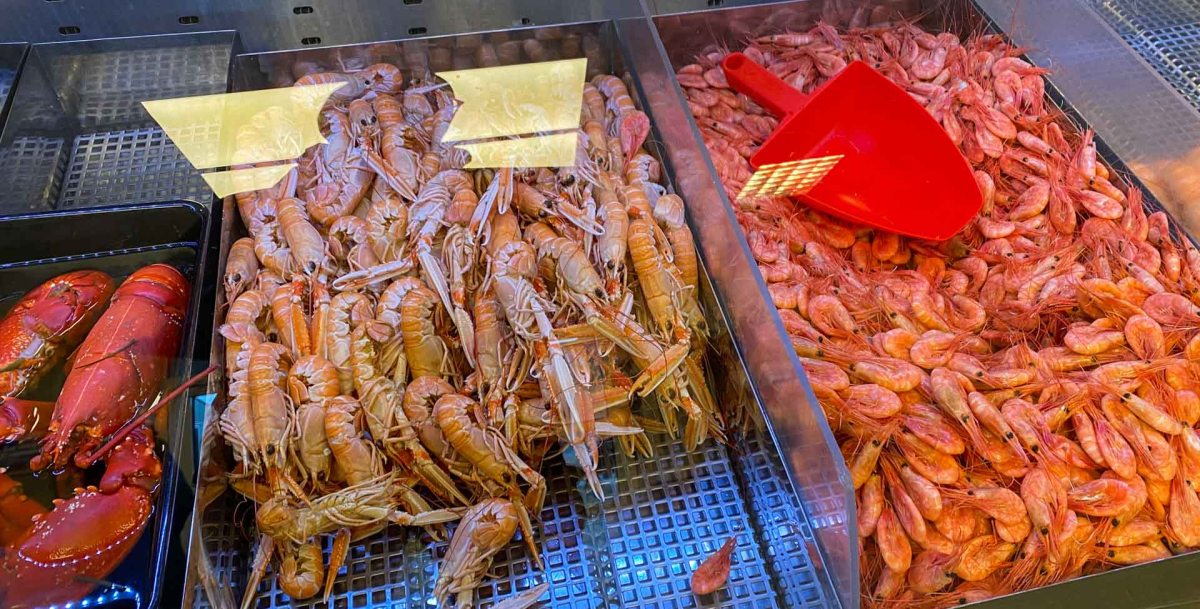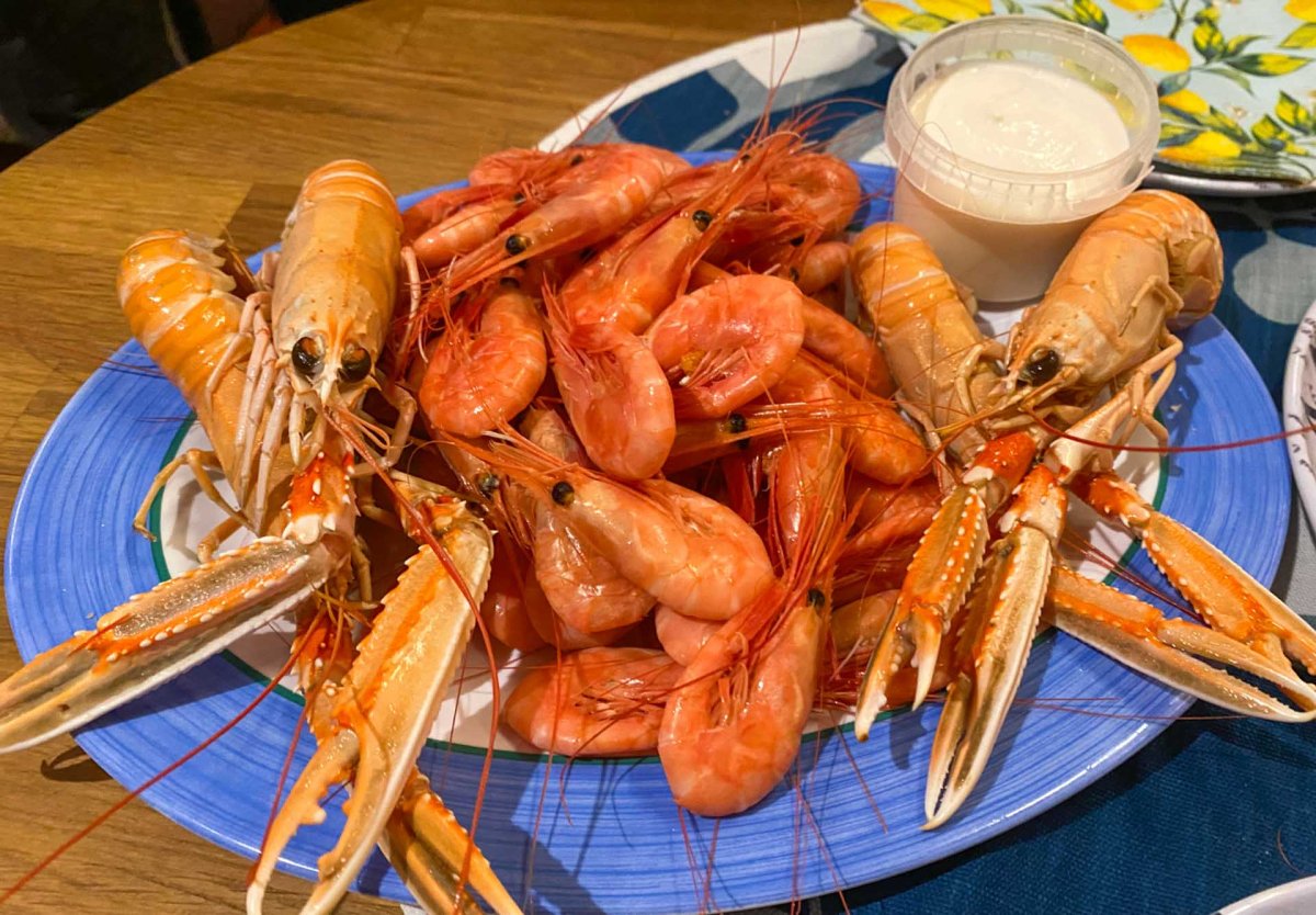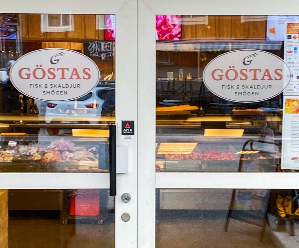 Vi går bort till Göstas Fisk som har året runt öppet både vad gäller restaurang och affär. Vi går in och tittar på alla godsaker. Humrarna, både de kokta och levande fick stanna kvar men räkor, några kräftor, en baguette och lite aioli fick följa med hem till husbilen. Det blev ytterligare en innekväll medan vindarna ruskade i Laikan.