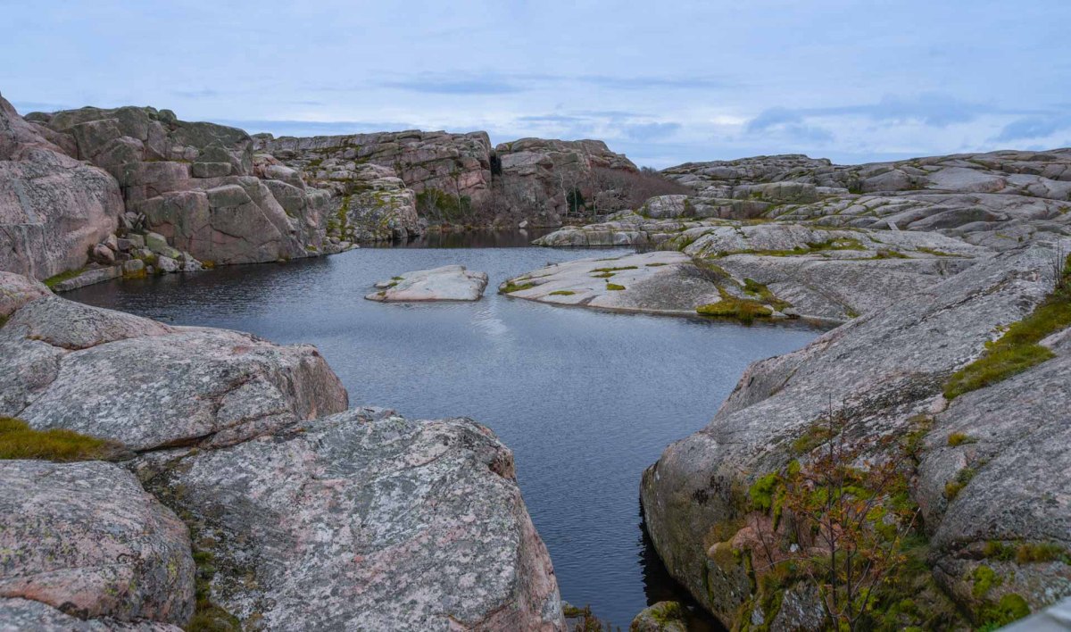När vi passerat mellan klipporna kommer vi först till Lindstedts myr. Det här var från början en oansenlig vattensamling, men efter uppdämning blev den betydligt större. Meningen var att man vintertid skulle kunna såga upp isblock till fiskets behov. Det här var åren 1940-1960 när vintrarna var kalla och somrarna varma. Under den här tiden var många båtar från Sotenäset involverade i sillfisket på Fladen grund och det gick åt mängder med is. Isen kunde lagras i en lagerbyggnad och höll sig till fram emot sommaren.