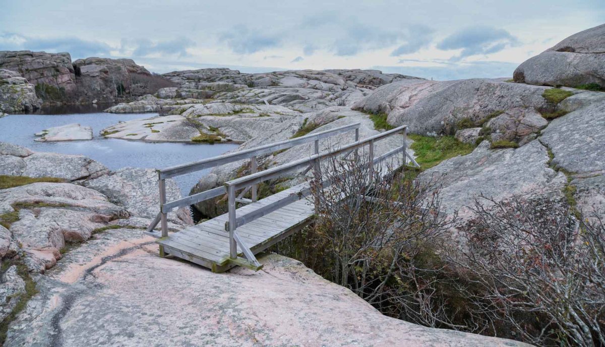 Efter en natt där vi sov så gott och en rejäl frukost lockade en kortare vandringsled på Kleven. Den började precis på andra sidan bron. Vi bodde alltså vid P på kartan.
