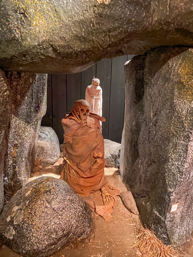 Sedan blev det stopp vid modellen av en gånggrift. I de här gravarna kunde upp till 150 personer begravas under en tidsrymd på några hundra år. De döda kropparna placerades sittande på huk, troligen insvepta i kanske en svinhud. Här på Falbygden har benknotor och keramikföremål stått emot nedbrytning riktigt bra, eftersom jorden och berggrunden är så kalkhaltig.