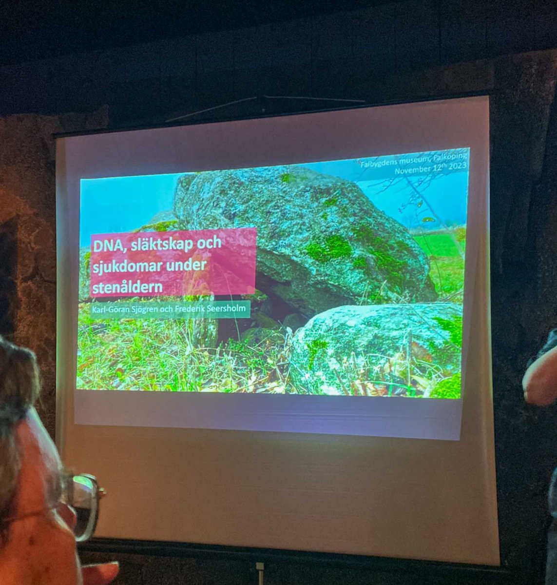 Jag med ett förflutet arbetsliv inom genetik har också gått på föreläsningen, ”DNA, släktskap och sjukdomar under stenåldern”, med Karl- Göran Sjögren, docent i arkeologi vid Göteborgs universitet och Frederik Valeur Seersholm, PostDoc i förhistorisk DNA vid Köpenhamns Universitet. Naturligtvis var även denna föreläsning fullbokad. K – G Sjögren var med i det första programmet och nu berättade han om en del av de ca 260 gånggrifterna som finns på Falbygden.