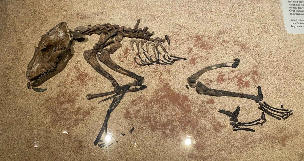 Efter en allmän information om stenåldern på Falbygden koncentrerade vi oss på tre företeelser. Först stannade vi vid den s k Almeöhunden, ett relativt komplett hundskelett som hittades vid Almeö, vid Hornborgasjöns strand vid utgrävningar 1983. Skelettet är Skandinaviens äldsta kända hund och över 9000 år gammalt. Den hade vid dess begravning beströtts med ockra så nog var det en betydelsefull familjemedlem.