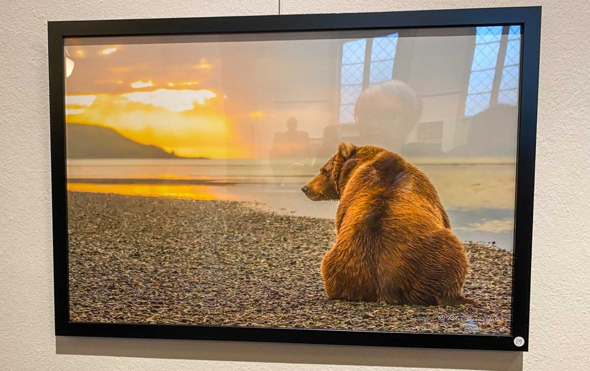 Det är Peter Bernerfalk, vars utställning heter ”Björnland”. Hans favoritmiljö är just vildmarker där björn, varg och andra djur samsas utifrån egna förutsättningar. Nu när vi var där fick vi också höra Peter Bernefalks föreläsning, Magiska möten i Björnland