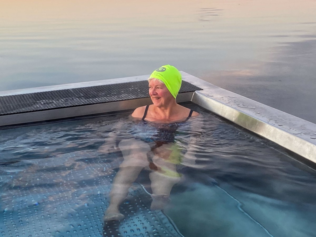 På pålar utanför ligger poolen 38G, som året runt bjuder på just 38°. Här tillbringade vi en lång stund, medan solen dalade, tillsammans med ett trevligt par som ofta var här ute och tänk att B-M t o m doppade i hela sig (utom huvudet) mellan de små isflaken. Det var faktiskt riktigt skönt även om det stack i hela kroppen när jag raskt kom tillbaka till den varma poolen och någon vinterbadare kommer jag aldrig att bli…