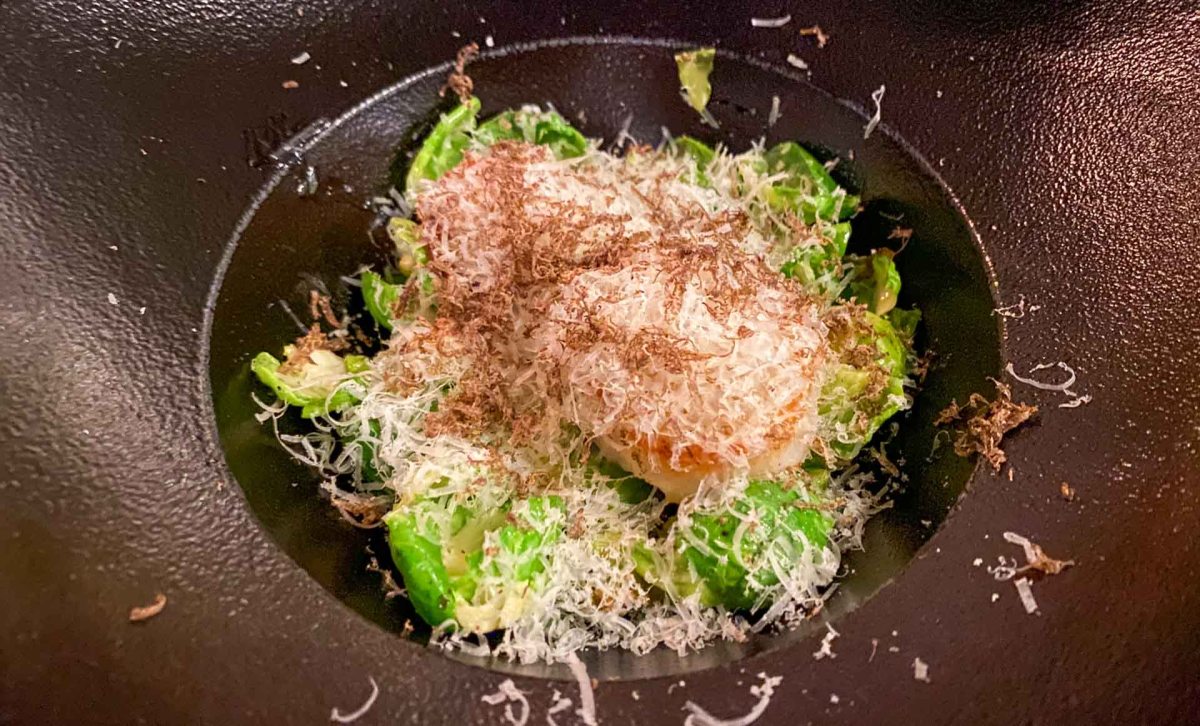 På kvällen började vi med några munsbitar och ett glas bubbel på Verandan, innan vi fortsatte in till restaurangen. Här fick vi välja förrätt och varmrätt från den ordinarie menyn och den här middagen var något av det mest smakfulla vi har ätit på länge. Vi startade båda två med smörstekta pilgrimsmusslor med bakad brysselkål, citronemulsion och färsk tryffel.