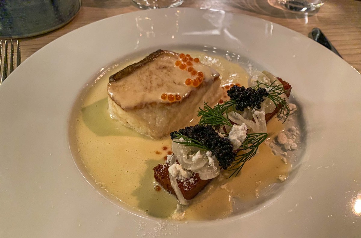 Sedan festade Lars på Hälleflundra som serverades med beurre blanc, forellrom och arenkhakaviar, potatishashbrown, äpplepicklad silverlök och ansjovissnö.