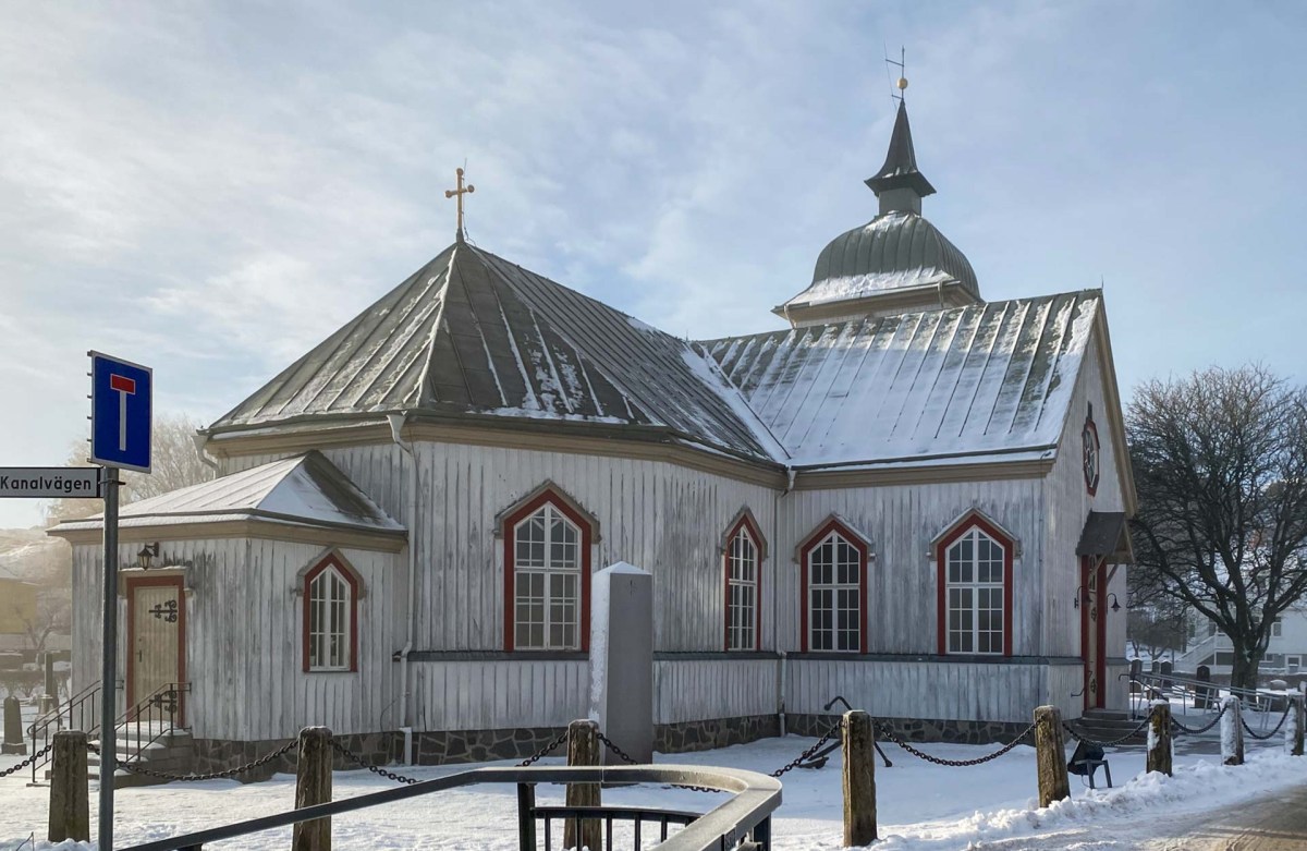 Här vid bron ligger också Grundsunds kyrka, en vitmålad träkyrka.