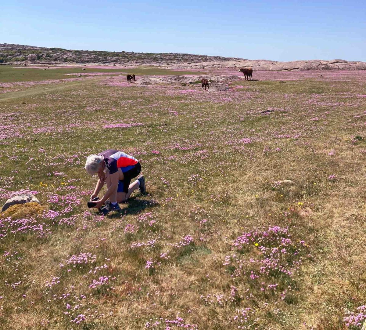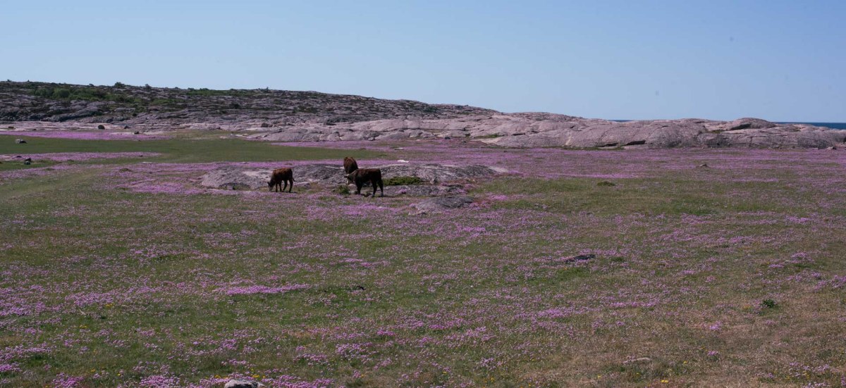 Ramsvikslandet är en del av Sotenäset och var en halvö fram till 1930-talet, då Sotenkanalen anlades. Idag är det ett av länets mest besökta naturreservat och med sin varierande och storslagna natur är det inte svårt att förstå. När vi åkt över Sotenkanalen åkte vi först söderut till Haby där Kerstin varit för några dagar sedan och där det lyst rosa av mattor med trift och lila av styvmorsviol. Nu kom vi inte ut på klipporna för kossor var just utsläppta på sommarbete och de råmade inte helt uppskattande när vi kom för nära.