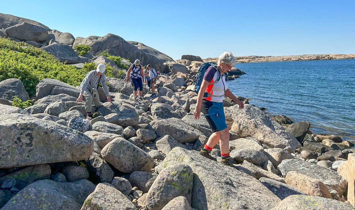 När vi sedan kommer ut till de blankputsade granithällarna, där det finns många minnen kvar sedan istiderna, är det givetvis dags för en längre kaffepaus. Att vandra och samtidigt umgås är verkligen perfekt och flera va våra kamrater hade inte varit just här tidigare.