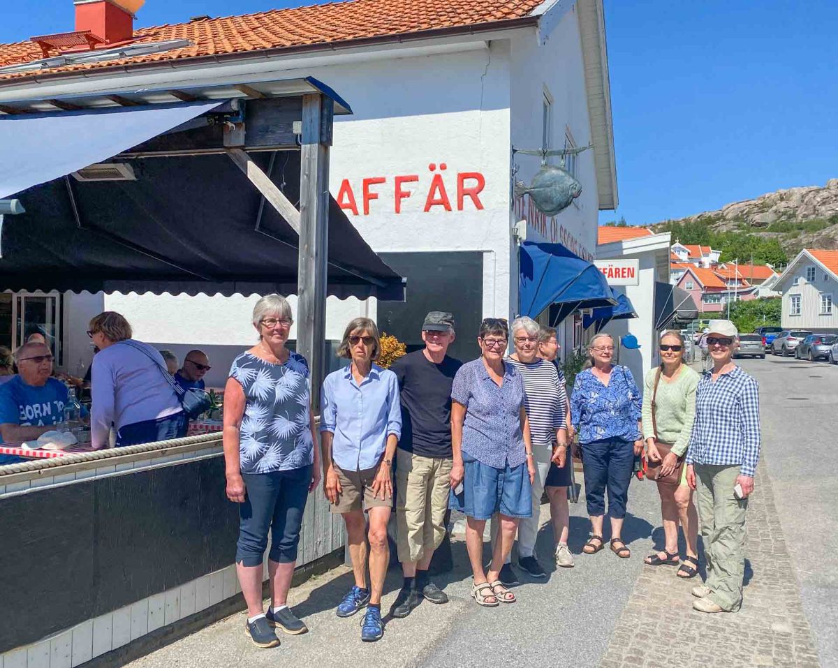 Nästa dag var det dags för en årligen återkommande aktivitet, nämligen vår gamla gymnasieklass vårvandring. I år hade Kerstin bjudit ut oss till fina Bohuslän och vi blev 10 stycken som träffades vid Fiskaffären i Hunnebostrand för att äta lunch innan vi åkte ut till Ramsvikslandet (ett av våra favoritresmål i Bohuslän). Dagens rätt var helstekt rödtunga med skirat smör, inte helt fel på en uteservering i hamnen.