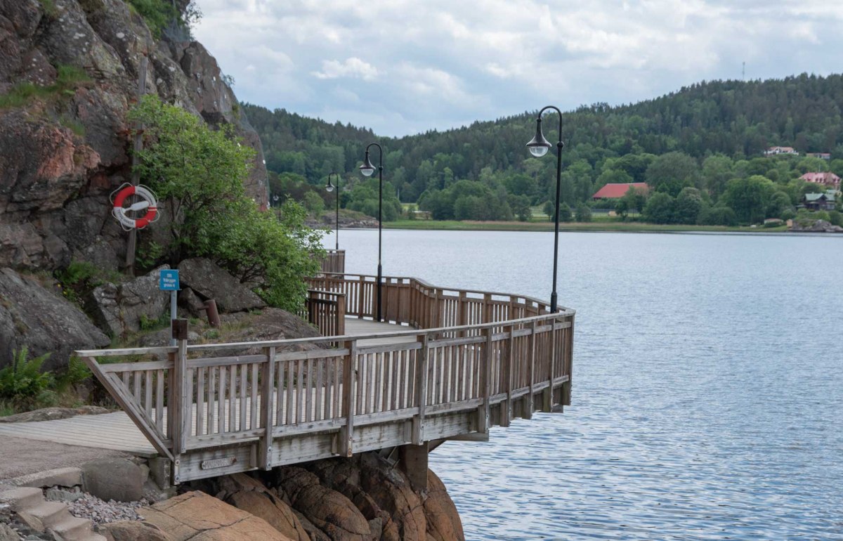 Vi vänder när vi passerat hela träbryggan och får på så sätt en promenad på 6 km. När vi kom tillbaka till Varmbadhuset passade det bra med en glasspaus på Konditori Snäckan. Snäckan var en enkel bod som flyttades hit på 1830-talet och byggdes om till bostäder för badgäster. Då låg huset helt intill vattnet. Kajen framför byggdes 1894.
