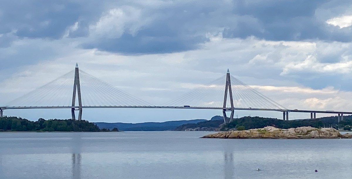 Nu börjar vi också skymta bryggdelen av Strandpromenaden. Den är ca en km lång och går från Skeppsviken till Bodeleviken. Det är verkligen ett otroligt byggnadsverk och nog behövs det rejäla stålkonstruktioner för att hålla upp hängbron vi passerar över. Härifrån hade vi en fin utsikt över Byfjorden med Uddevallabron i fjärran.