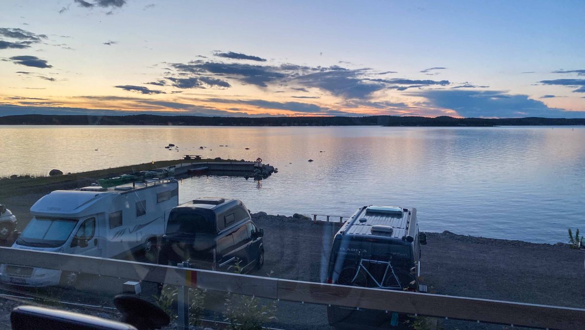 När vi installerat oss och märkt ut vår plats åkte vi in till våra vänner. Det blev en riktigt trevlig kväll med mycket prat då det numera blir långt mellan gångerna vi ses. Sedan blev vi bjudna på en magiskt god älggryta och glass med rullrån och hjortronsylt till dessert. Nu kändes det att vi var i Norrland och att värden dessutom är en inbiten jägare. När vi kom tillbaka till ställplatsen var det fortfarande inte mörkt (nu har vi kommit lite längre norrut) så vi satt en stund och bara njöt av utsikten.