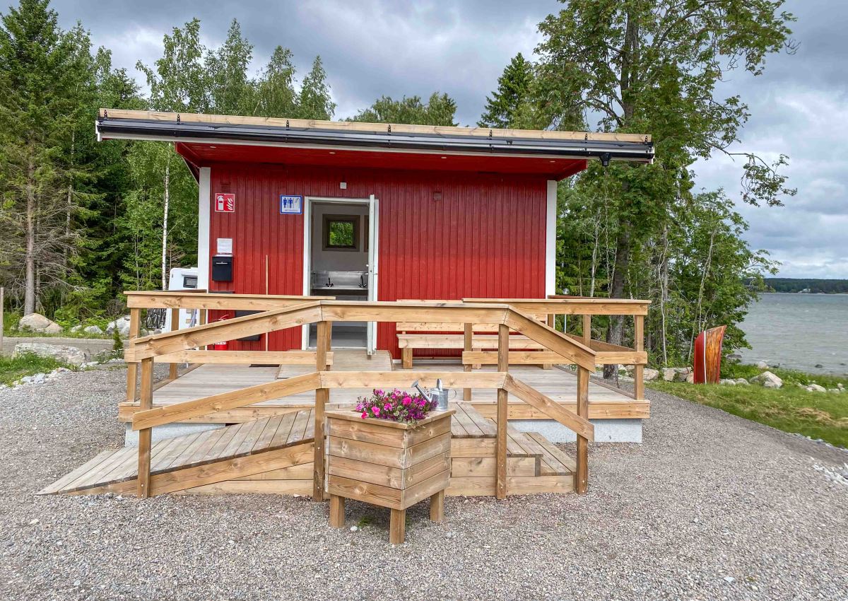 Vi hade hört om en fin, relativt ny ställplats ca 7 km utanför centrum, Urö gård, så dit ställde vi kosan. Den höll verkligen för våra högt ställda förväntningar. Ställplatsen har 17 platser med el och havsutsikt då den är byggd i två etage. Där finns ett nybyggt servicehus med två duschar och två toaletter, samt en utedisk. Dessutom finns tömning och fyllning, en glasskiosk med självbetjäning i en jordkällare och en grillplats nere vid vattnet. för detta betalar vi 200 kr/natt.