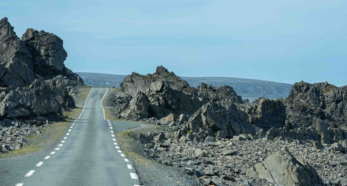 Många har rekommenderat oss att fortsätta norrut, drygt fyra mil, på den Nationella Turistvägen till Hamningberg och då är det inte orten som är den stora sevärdheten utan den spektakulära vägen dit. Naturligtvis lyder vi rådet och efter en bit ändras naturen och det känns som om vi kör genom ett månlandskap. Vägen är asfalterad och av hyfsad kvalitet även om den är smal men mötesplatser finns det ganska gott om så det fungerar riktigt bra.