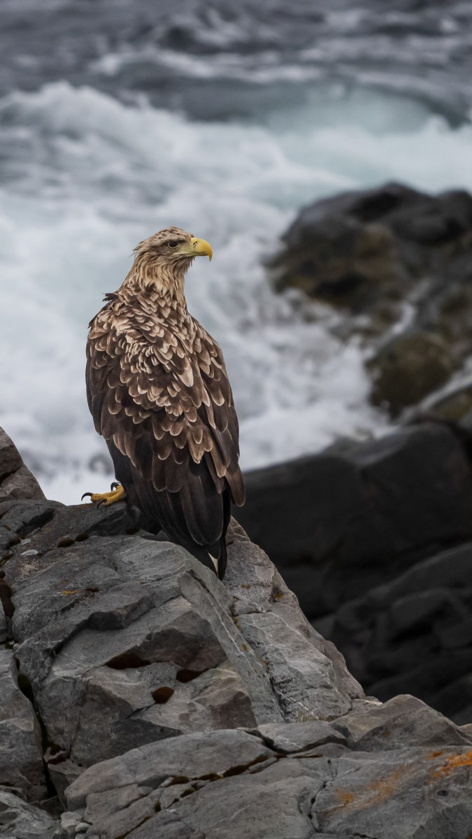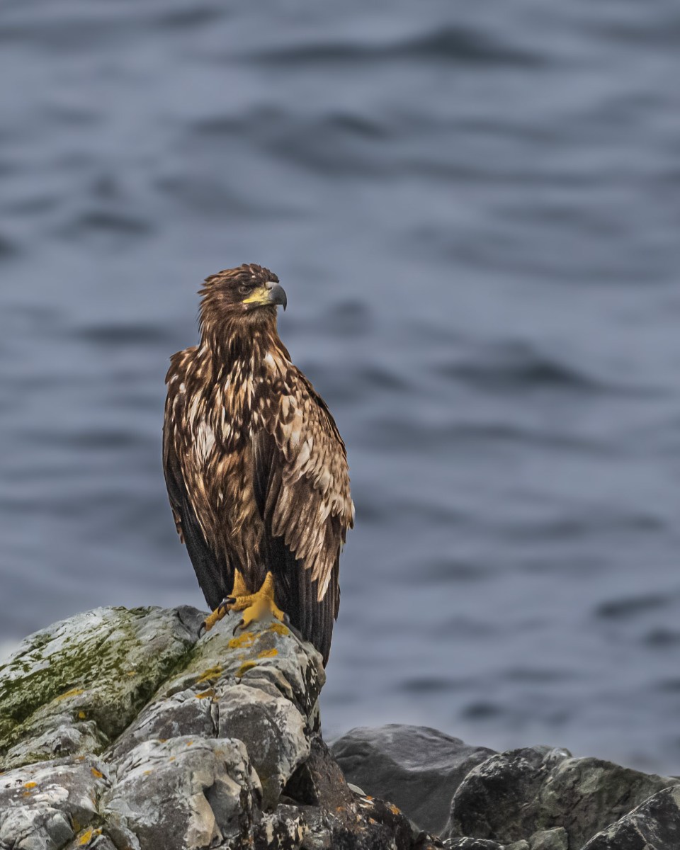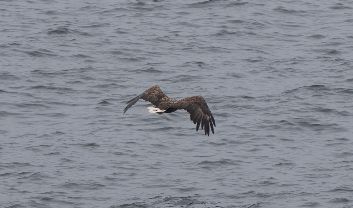 Nästa morgon börjar vi åka tillbaka samma väg och plötsligt ser vi våra tyska grannar från nattens parkering, som kört av vägen på en liten avfart. Samtidigt får vi se vad som fått dem att stanna, nämligen två vackra havsörnar, som sitter på var sin sten i vattenkanten, ett tjugotal meter bort. Tyvärr kunde vi inte stanna på den smala vägen utan fick fortsätta ett litet stycke till. När jag väl kom ut ur bilen kunde jag bara se baken på de underbara fåglarna, som blivit skrämda när vår bil kom farande.