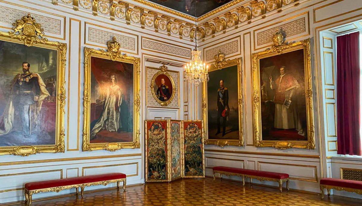 Yvonne och jag löste vår entré och om vi ville kunde vi ladda ner en audioguide, som berättade om rummen vi vistades i. Flera av rummen tyckte vi var mörka, men visst förstår vi att den inte alltid så snälla solen behöver stängas ute med tjocka gardiner. Endast ett par av rummen används idag, bl a Rikssalen på andra våning där man höll en stor middag under kungens jubileumsår. Salen kallas även Contemporainsalen på grund av alla de porträtt i helfigur av europeiska regenter som fanns under Oscar I:s tid. I salen finns 20 regentporträtt där 17 är målade i helfigur och tre utgör midjebilder som fick plats över dörrarna. Det vackra taket ska visa Pandoras födelse.