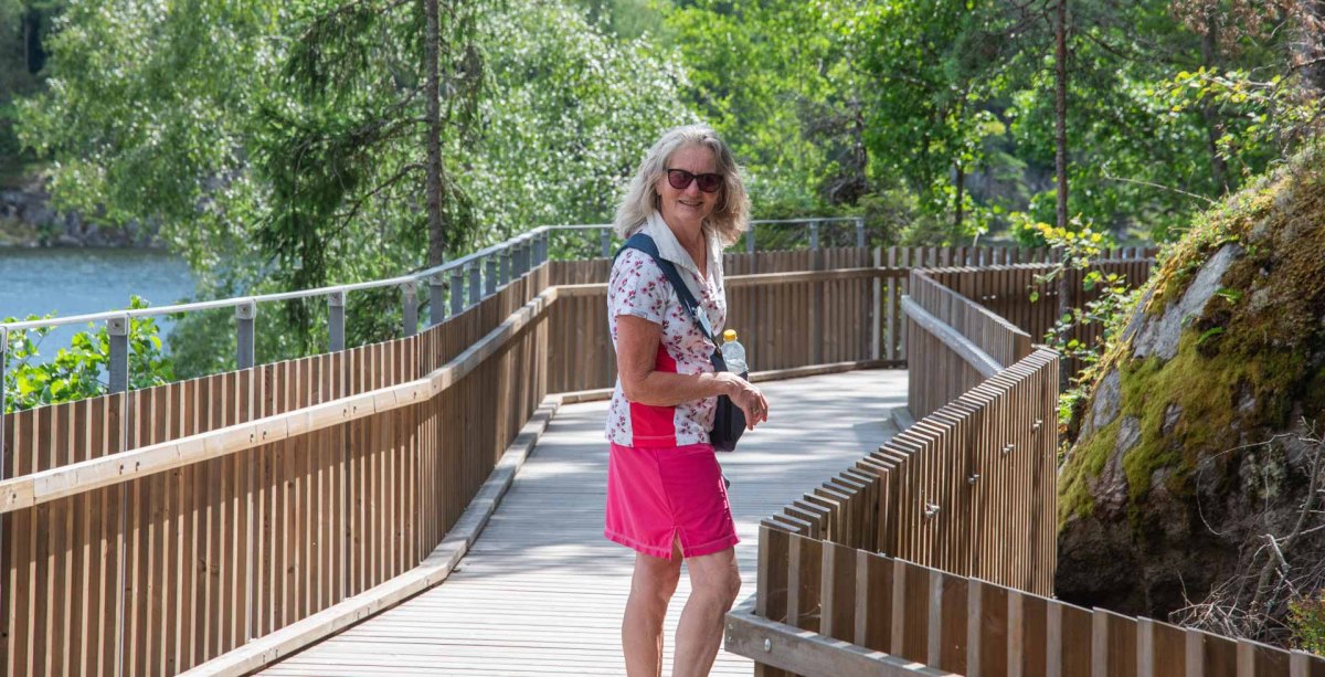 Efter nio hål hoppade Yvonne av och efter lite fika åkte vi ut till Alby friluftsområde. Härifrån går det en vandringsled, som leder mot Tyresta naturreservat. Efter en bit kuperad vandring kommer vi till en nyanlagd bro, som förbinder Alby med Tyresta.