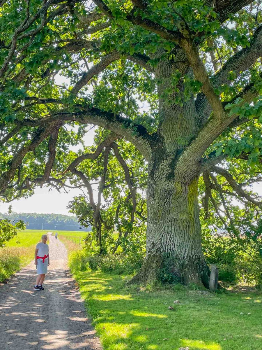 Då bestämde vi oss för att ta en promenad bort till Läckö dit vi skulle ta cyklarna senare på dagen. Det finns en cykel/gångväg över åkrarna som bara är 2,5 km så det blev en lagom promenad. På vägen passerar vi en gigantisk ek som vi fascineras av var gång vi ser den, att grenarna verkligen håller när höststormarna viner.