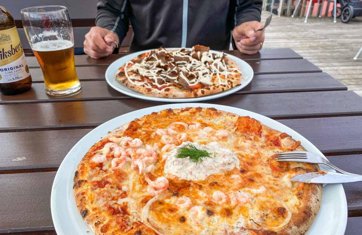 Vi tog naturligtvis en promenad mellan sjöbodarna och plötsligt kände vi att det inte skulle vara fel med lunch. Vi hamnade därför med varsin pizza på en takservering i det sköna vädret. Vi äter kanske bara köpt pizza ett par gånger/år och delar ofta på en så efter det här skrovmålet mådde vi nästan….