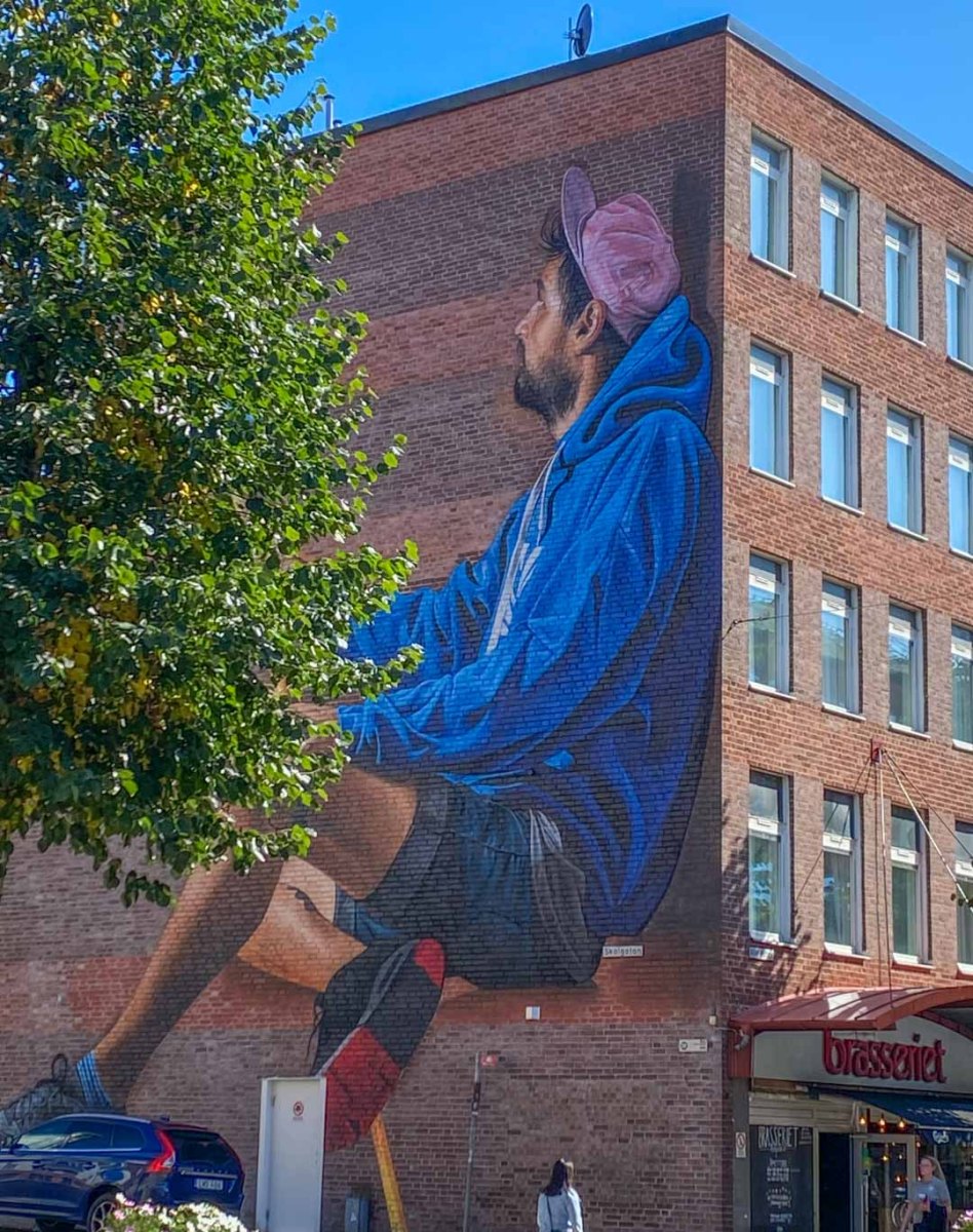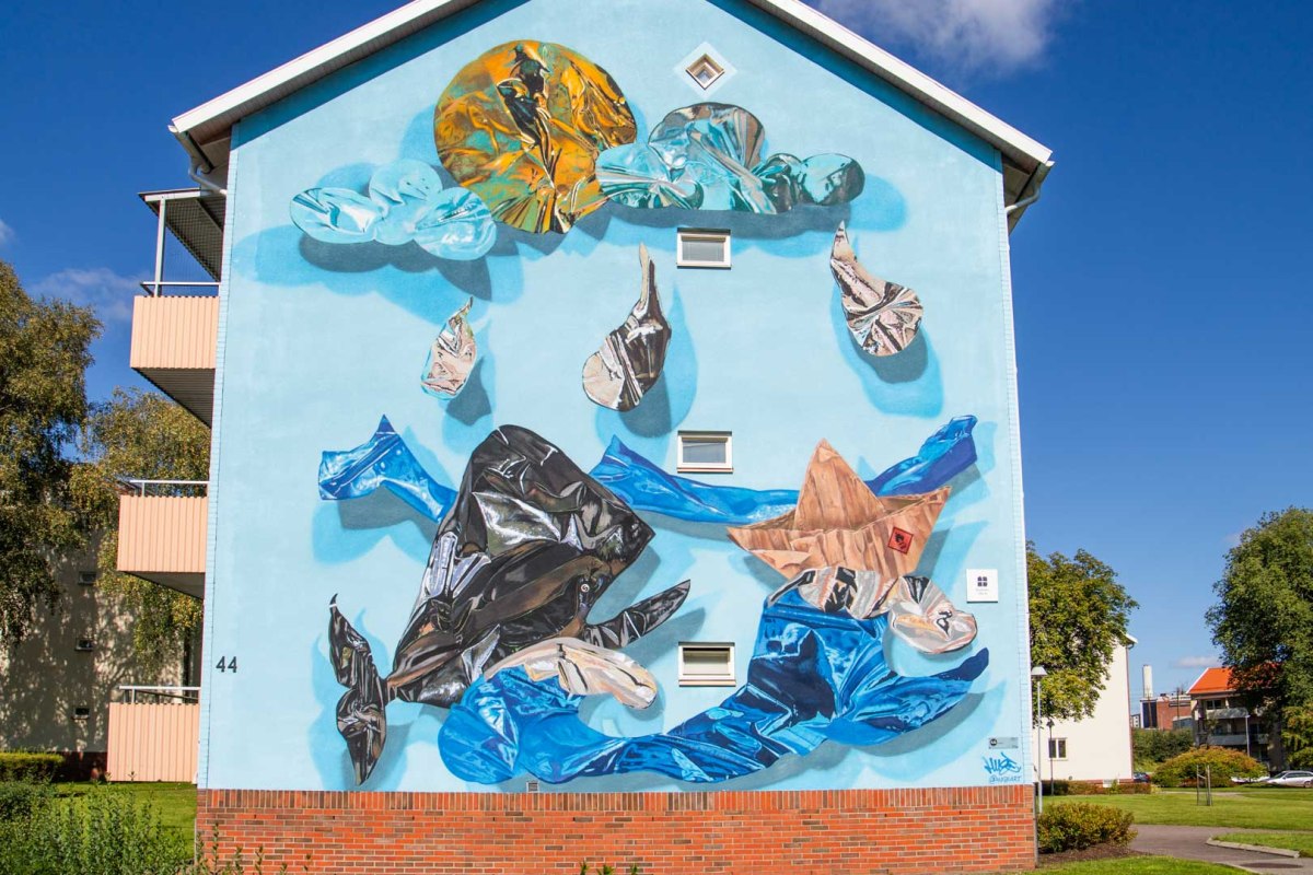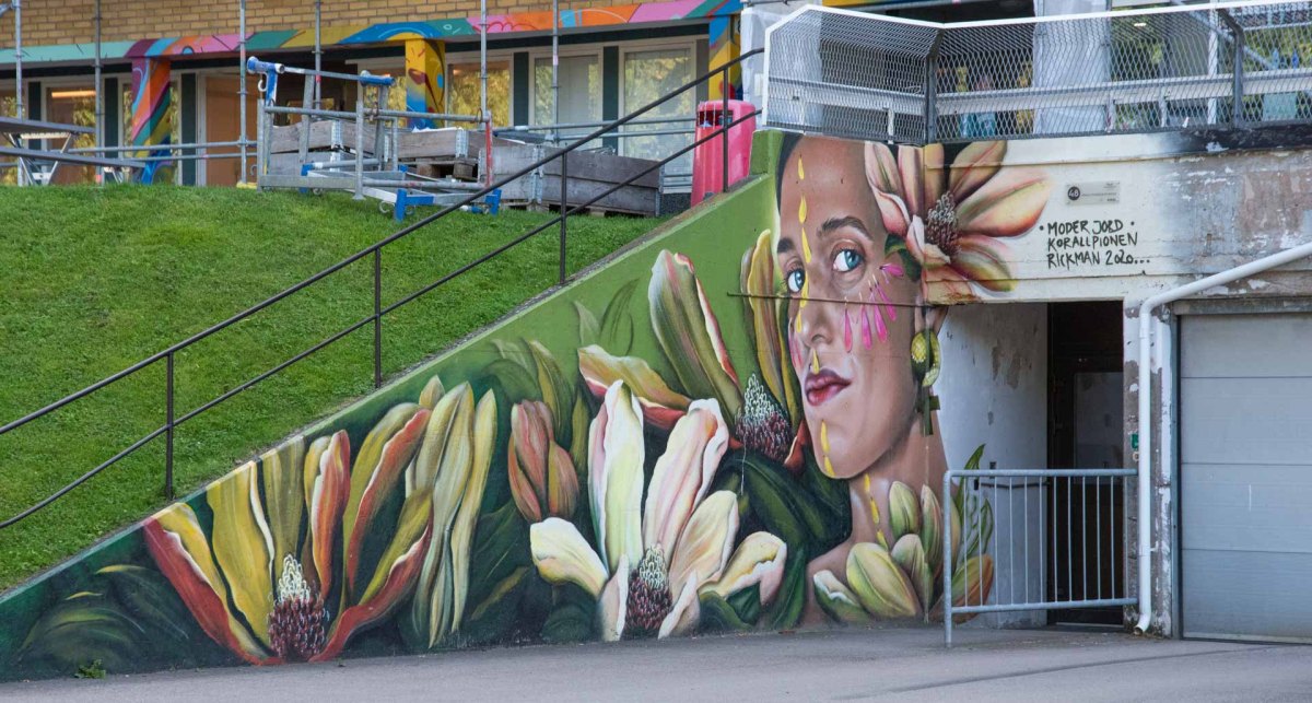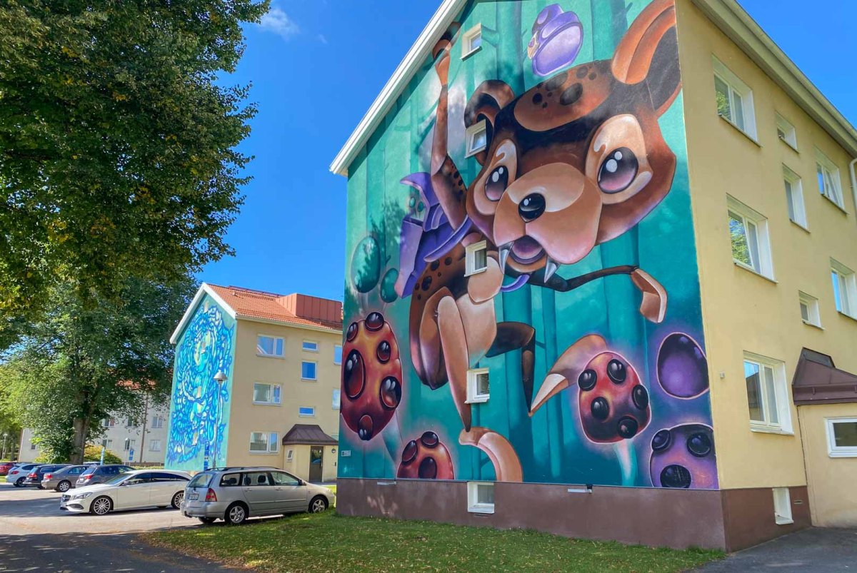 Sedan siktar vi in oss på en runda i stadsdelen Norrby, dit street art- festivalen koncentrerades 2020. Det är en stadsdel där en stor del av invånarna har en utländsk bakgrund och vi möts av många olika språk under vår promenad. Här kommer ett litet urval av alla häftiga målningar.