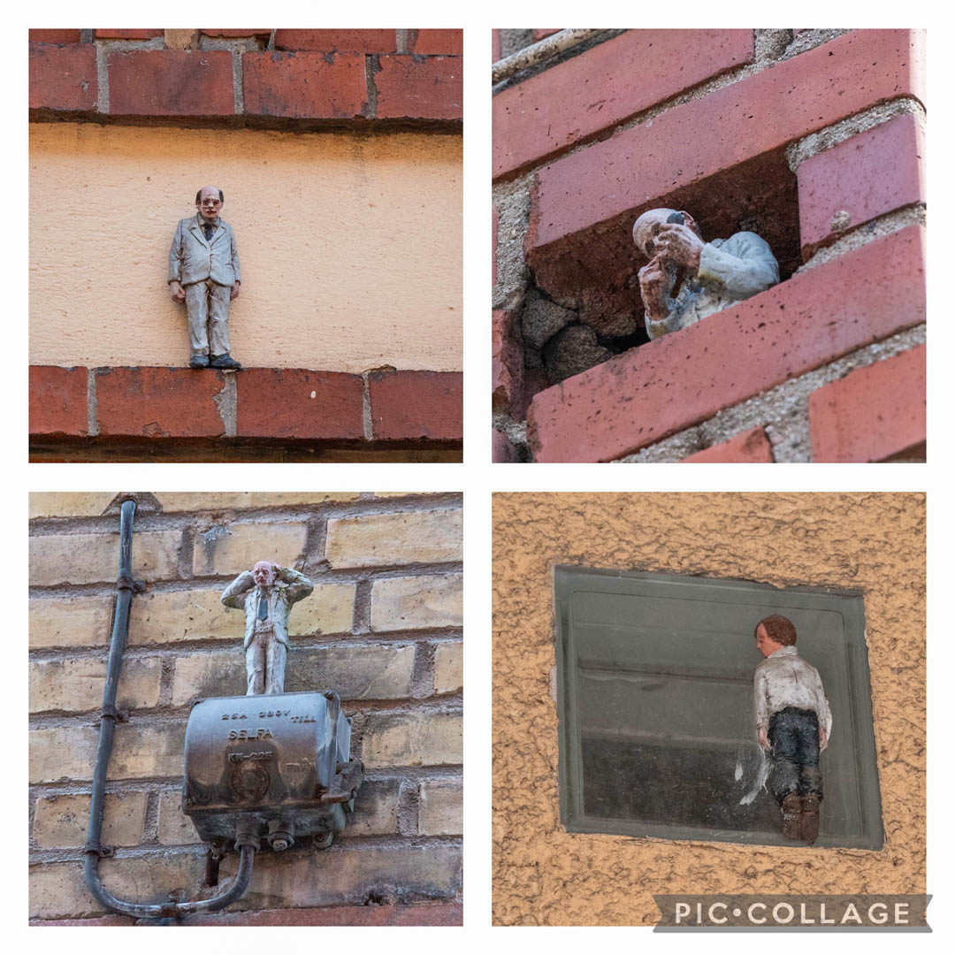 När vi sedan återvänder över Viskan börjar vi titta efter ”små mystiska män”! Det är spanjoren Isaac Cordal som gör de här små männen i olika, ofta vardagliga sammanhang. Sedan placerar han ut dem på noga uttänkta platser och vi får nog inse att hade vi inte vetat var de skulle finnas så hade vi nog aldrig sett dem… Enligt kartan ska de finnas på ett tjugotal platser och vi såg knappt hälften av dem.