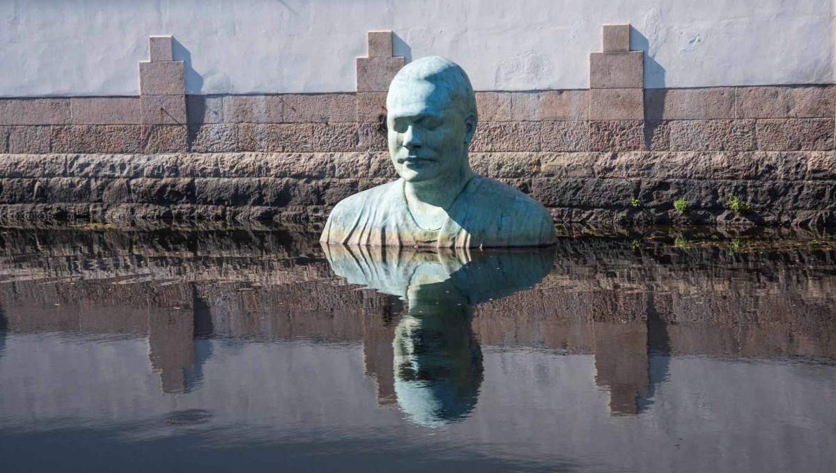 Vårt första stopp blev vid bron över Viskan där Fredrik Wretmans skulptur Bodhi (blivande Buddha) sitter i ån med ryggen mot biografen Böda Kvarn.