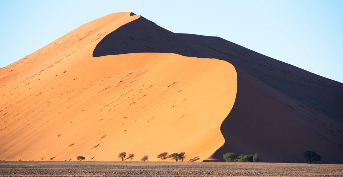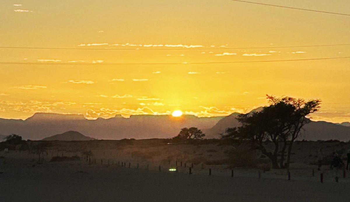 Det blir definitivt inget nattsudd på den här resan eftersom vi ska sitta i bussen kl. 05 nästa morgon med medskickade frukostlådor.Detta för att vi ska besöka en av höjdpunkterna på resan; sanddynerna i Sossusvlei och de torkade, förstenade träden i Deadvlei. Vi har en timmes körning till grindarna till parken Namib Naukluft och dessa öppnar alltid vid soluppgången, vilken idag är 06:03. Det är en del fordon som köar så istället går vi ut och inväntar det spektakulära ögonblicket när solen stiger över bergskanten.