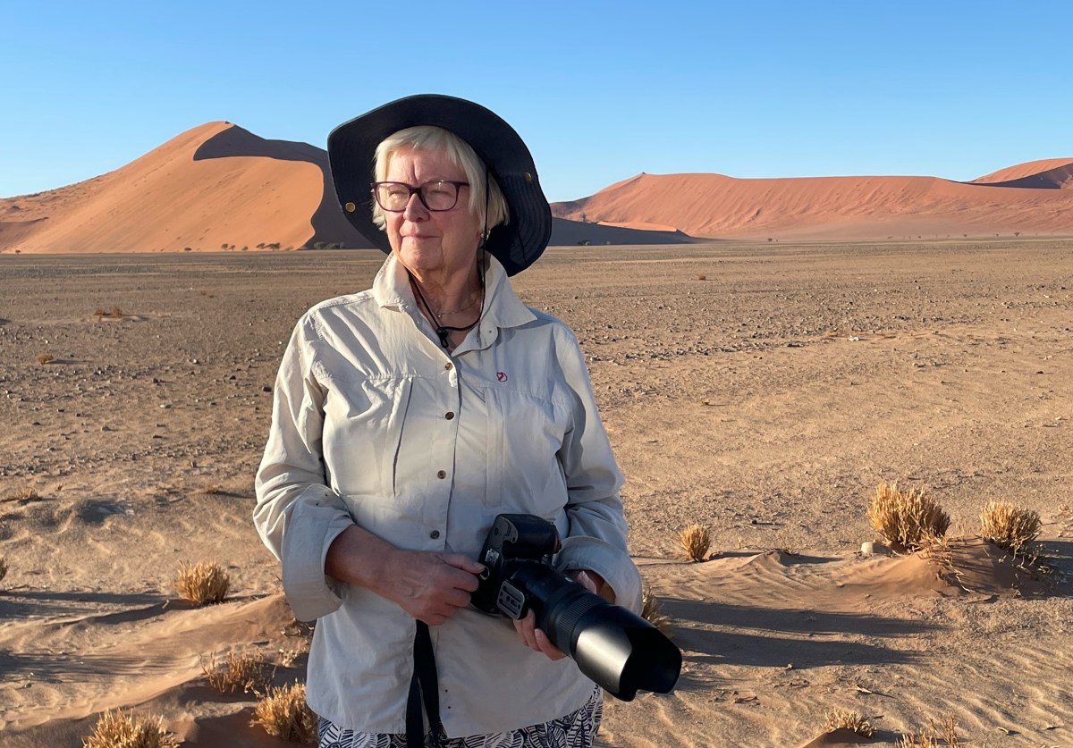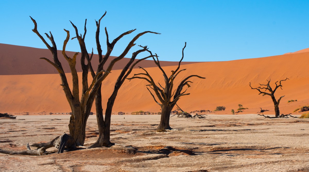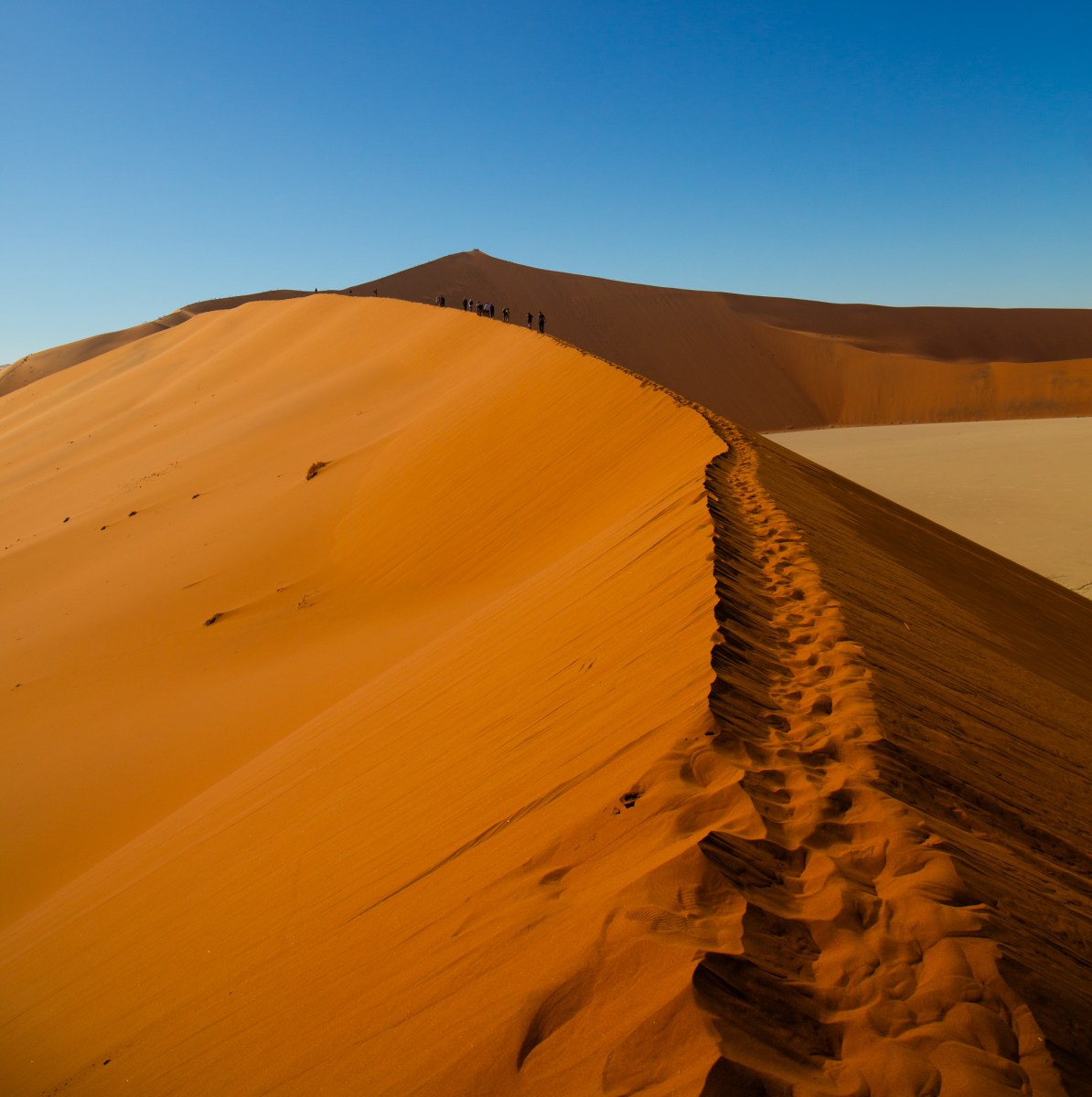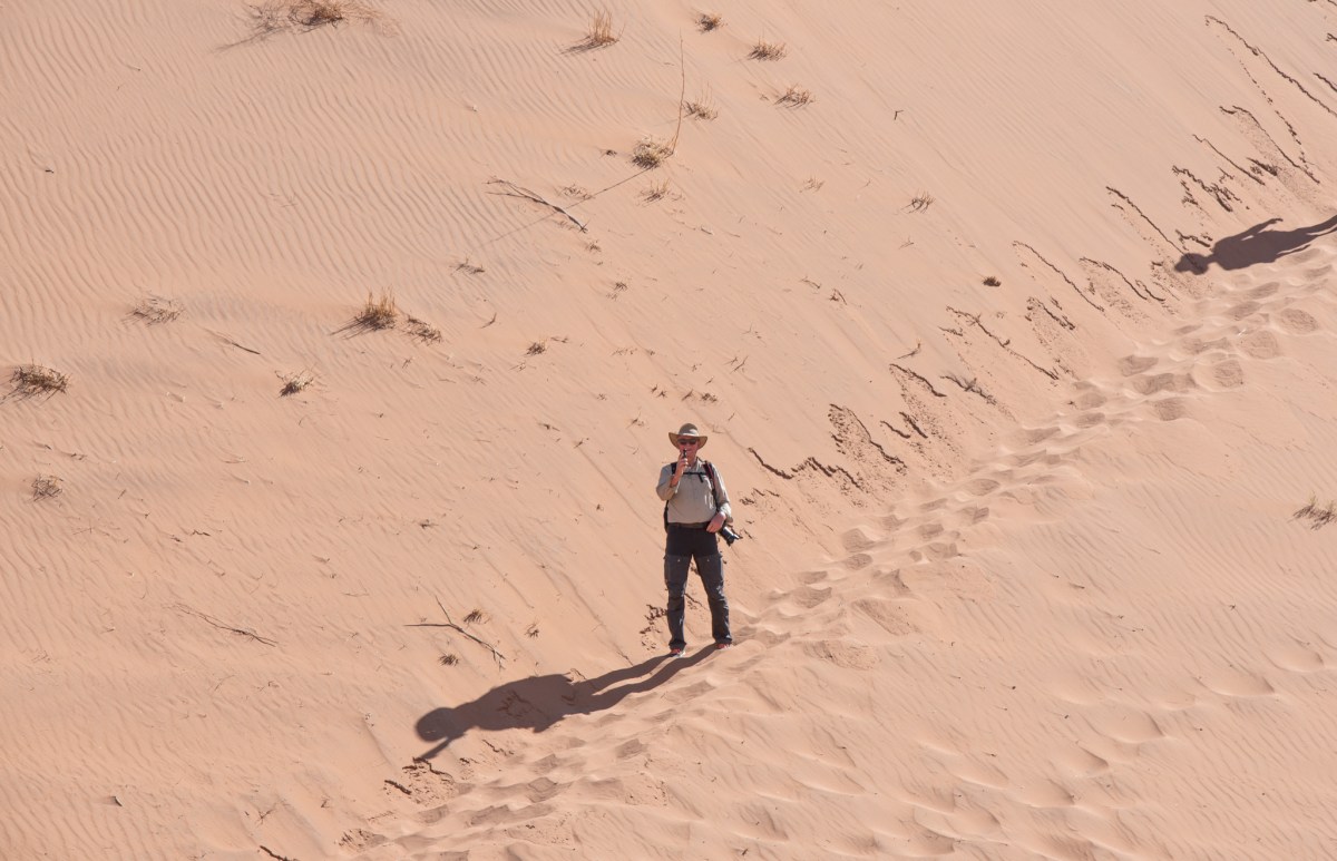 Jag (B-M) går istället den enklare vägen, som var 2,2 km till målet. Även här blev det stundtals två steg fram och ett steg bak i den lösa sanden. Deadvlei är alltså den torkade vita lerpannan mellan de höga sanddynerna. Deadvlei betyder ”Dött kärr”. Den bildades efter nederbörd, när floden Tsauchab svämmade över och skapade tillfälligt grunda pooler, där vattnet tillät träd att växa. När klimatet ändrades blev det torka och träden dog. De återstående skeletten av träd som tros vara 900 år är nu svarta och brända av den intensiva hettan. De har inte sönderfallit eftersom området är så torrt, så nu kan vi få komma och se de här otroliga vyerna.