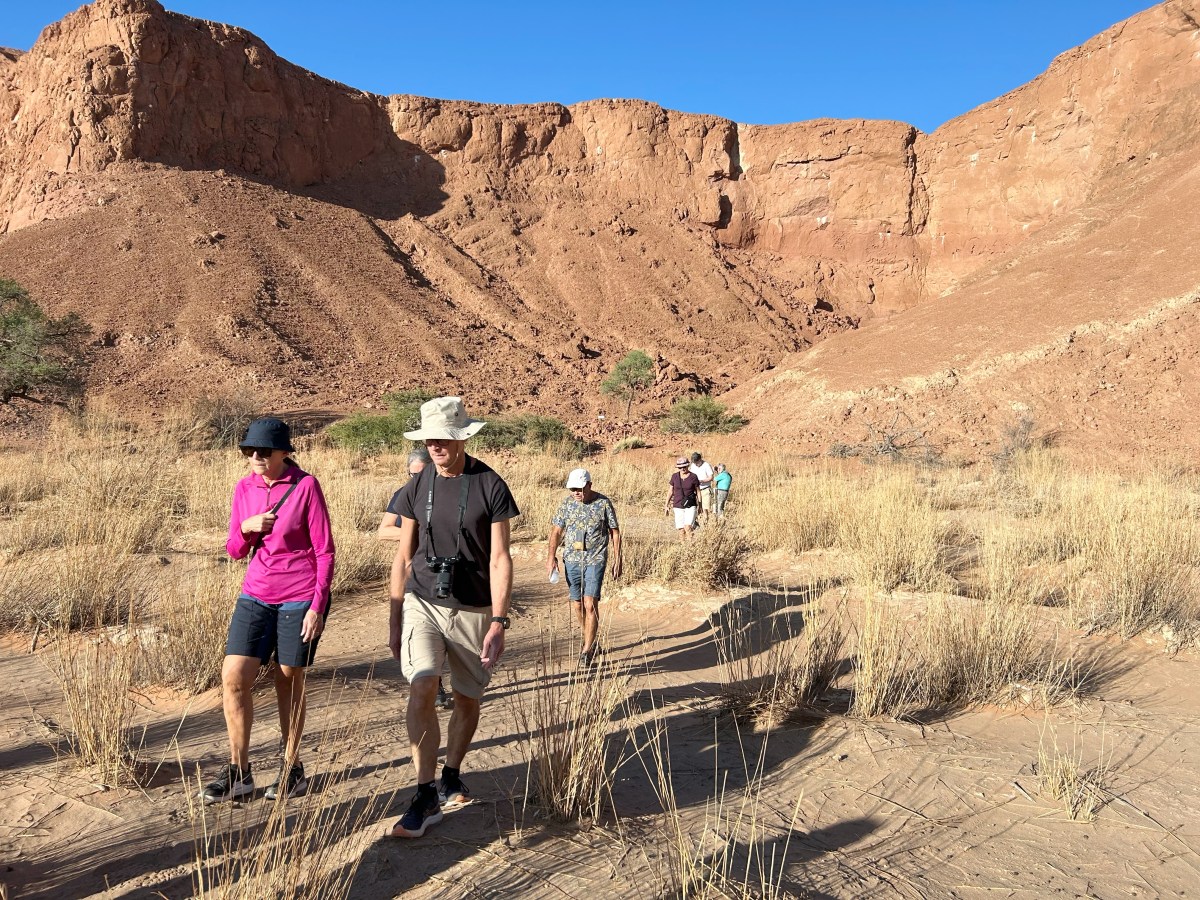 Vår sista morgon på det här stället fick de som ville följa med vår härliga reseledare, Stina på en morgonpromenad. Det var ”uppställning” kl. 07 och redan nu lyste solen riktigt varmt så ”hatt på” var verkligen tvunget. Det var så skönt att röra på oss lite innan frukost eftersom en lång resdag i bussen väntade. Vi gick mot bergen, som en gång varit sanddyner men sedan förstenats. Längs vägen tittade vi efter spår från djuren som vistas där, bl a schakalens små spår.