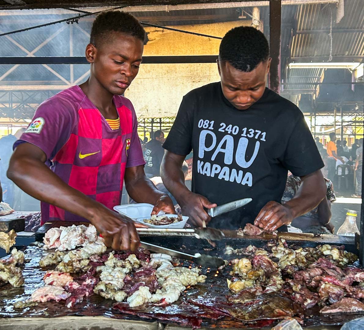 På köttavdelningen kan vi väl inte påstå att vi blev direkt sugna på lunch även om det som tillagades på de stora stekborden faktiskt doftade ganska gott. Uannie köpte ett par portioner mat som han gav bort till några små pojkar.