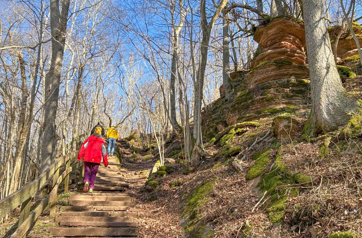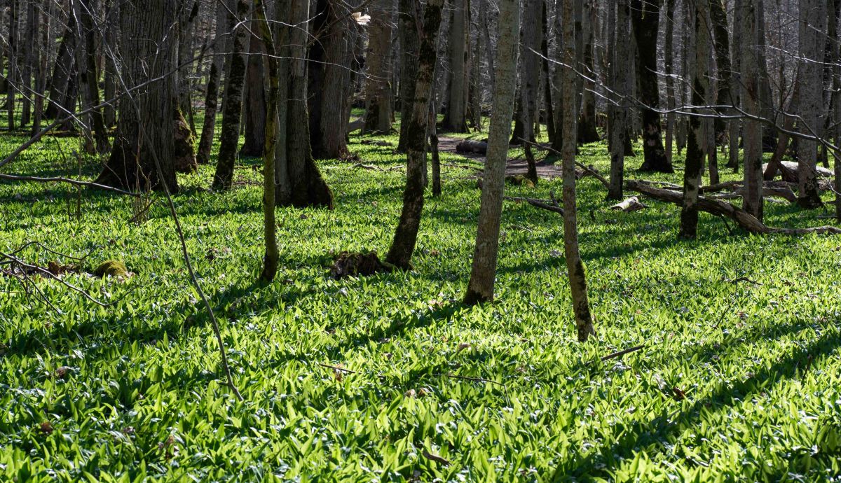 Vi går nerför de branta trapporna och här nere mellan träden lyser de späda ramslöksbladen riktigt vårgröna. I slutet av maj är här ett vitt hav av blommande ramslök och det är bara så vackert… Då får det säkert bli ett nytt besök upp till ”Det blommande berget” som Linné kallade Kinnekulle.