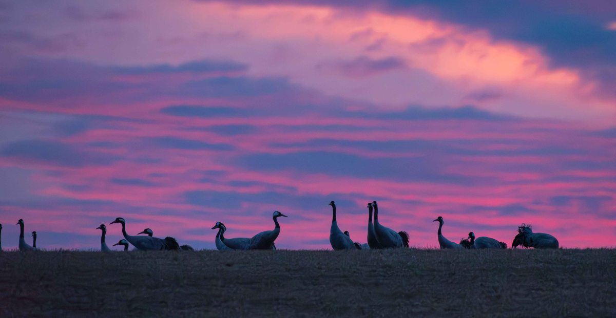 Det blev verkligen inget nattsudd då vi tänkte oss upp i ottan för att se när tranorna återvänder från sin nattsömn ute i sjön för att förse sig av det korn som spridits ut under kvällen. Det blev inte den där vackra soluppgången som vi upplevt vid ett tidigare tillfälle…