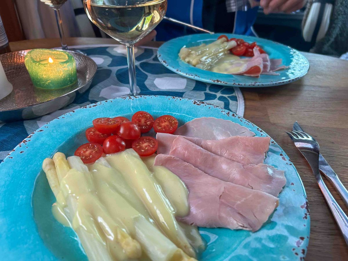 På kvällen njöt vi av en riktig vårmiddag, nämligen vit sparris med hollandaisesås och kokt skinka. En skål jordgubbar blev vår efterrätt. Kan det bli mer Valborg och vår på tallriken???