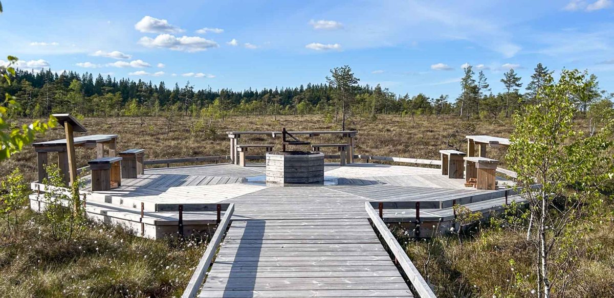 Komosse räkna som södra Sveriges största myrområde. Vi åker till parkeringen vid Mörkö, norr om sjön Trehörningen. Härifrån utgår Björnöleden, en knappt fem km lång natur – och kulturstig, som till stora delar är spångad. Här på parkeringen får vi även övernatta och platsen finns med på Park4night.