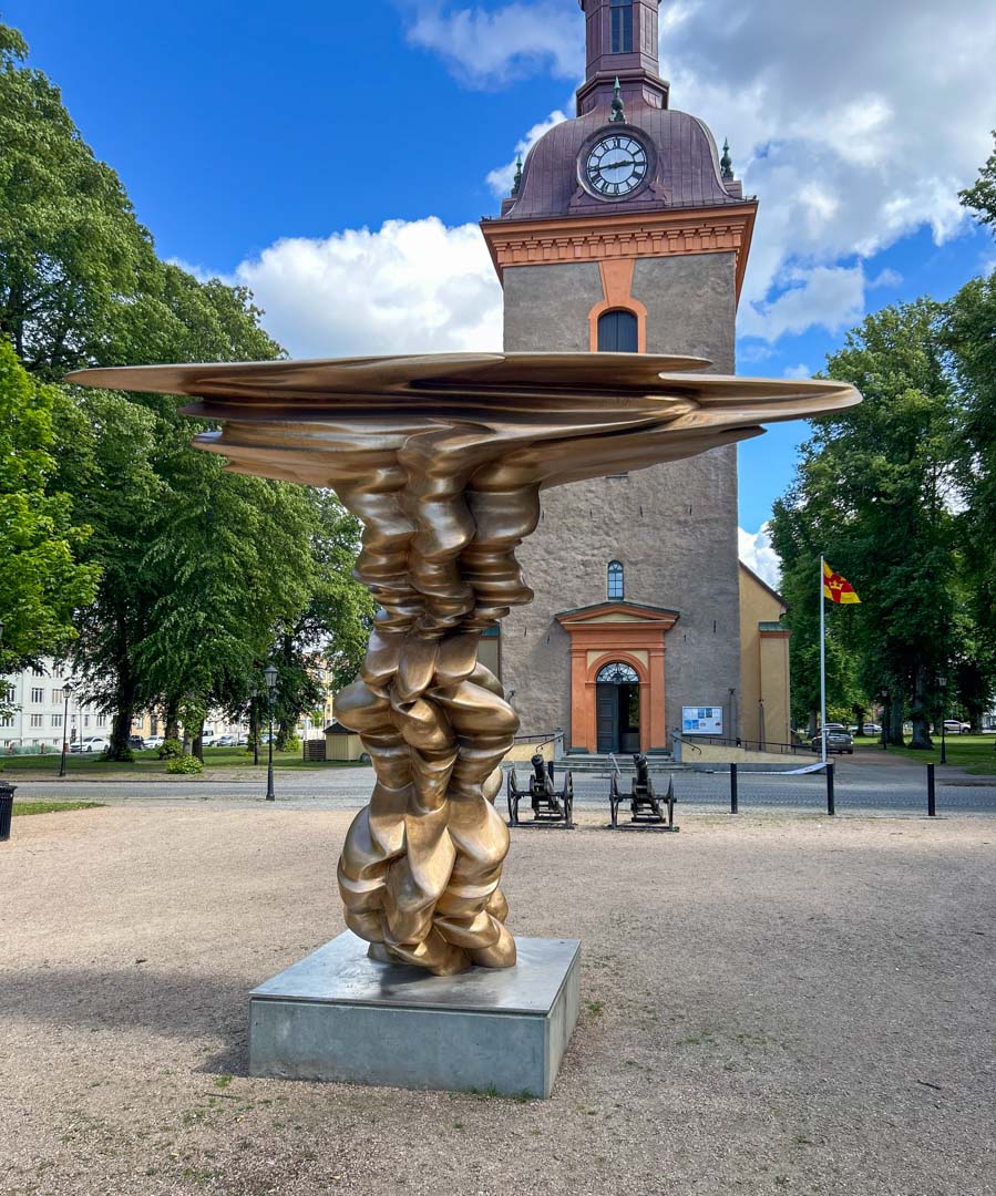 Sedan fortsätter vi upp genom staden för att titta på den officiella ställplatsen som ska ligga vid Resecentrum. Då går vi förbi kyrkan och framför den står sedan förra sommaren en skulptur av Tony Cragg, ”Must be”. Hans häftiga skulpturer har vi tidigare sett i bl a Pilane.