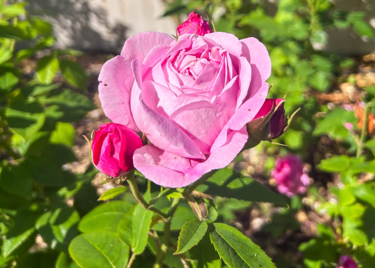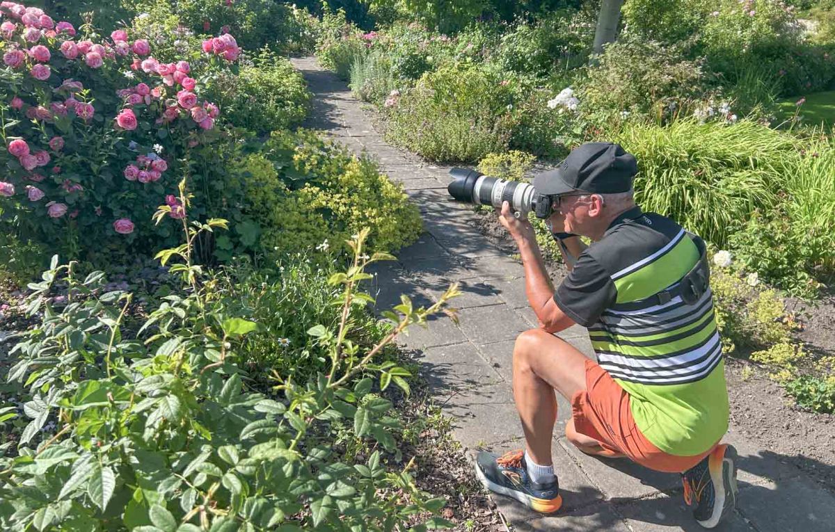 Vi går ner mot hamnen och längs vägen kommer vi till den lilla fina örtagården. Den startade som ett skolprojekt 1988 men drivs numera av en grupp pensionärer som är en del av Föreningen Mot Bättre Vetandes verksamhet. Här doftar det citronmeliss, timjan och andra kryddor. Merparten av det som blommar är ändå rosor även om en del av dem snart är överblommade.