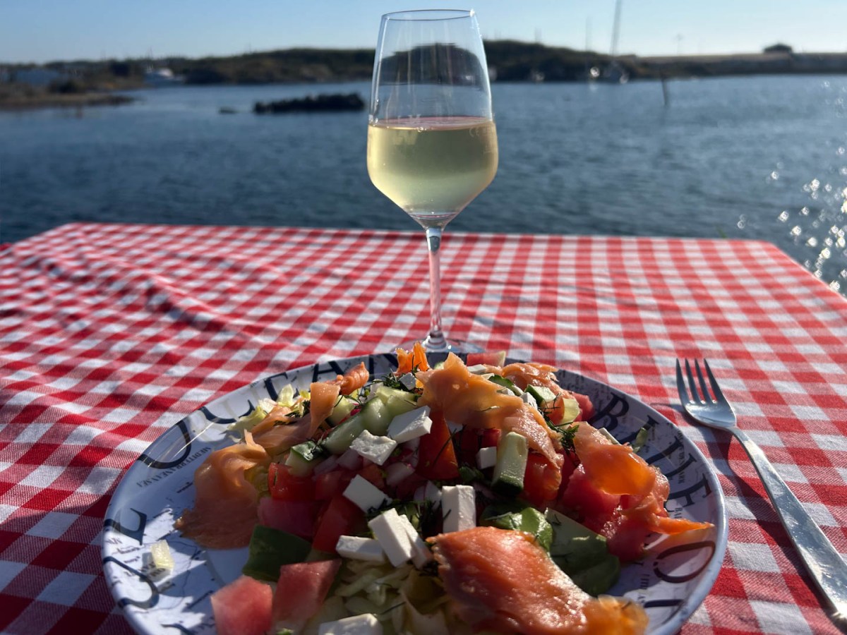 Musik har alltid spelat en stor roll här och varje torsdagskväll på sommaren bjuds det på musik och pepparmyntste. Nu var det faktiskt torsdag men vi kände bara att det skulle bli skönt att komma hem och slå oss ner. När vi kom hem till Laikan fick vi vara mer än nöjda med dagens motion. Stegräknaren visade nästan 11 km promenad och så en cykeltur på det. Vi njöt då av en god sallad och en flaska riesling, vår sista kväll på öarna för den här gången.