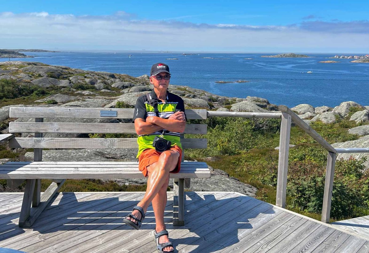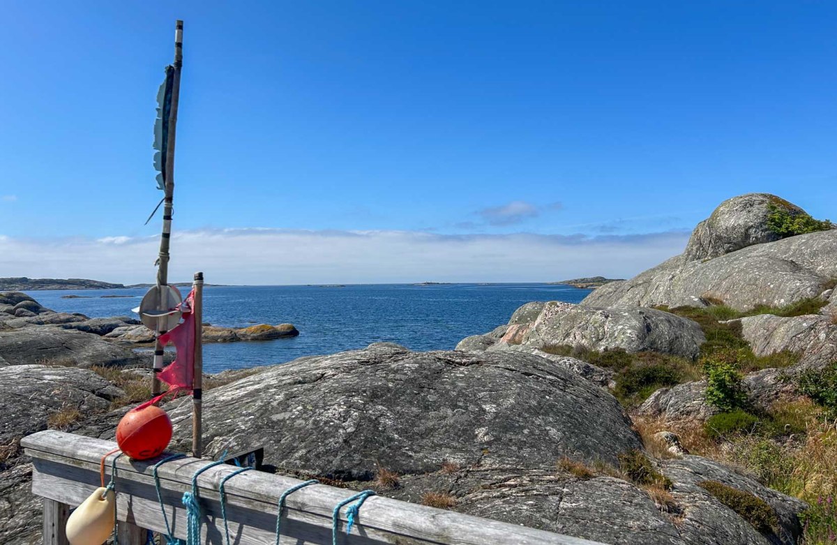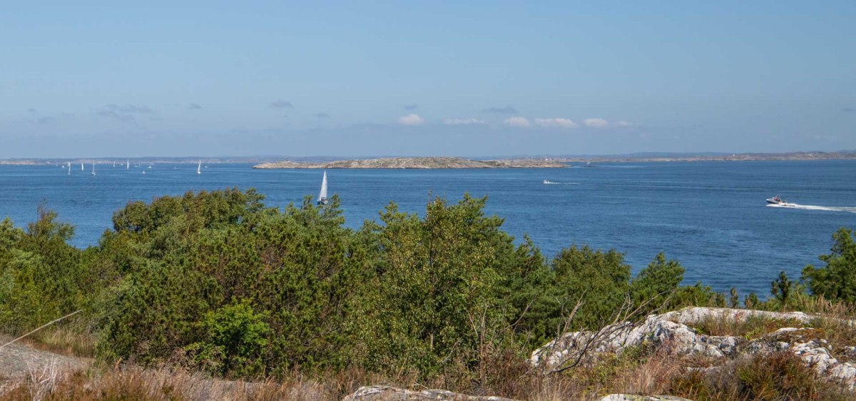 På ön ligger nästan all bebyggelse på sydsidan, så vi följer vägen som går längs kusten, mot norr där det ska finnas en vandringsled, kallad ”Slingan”, som vi hoppas ska ge oss många fina vyer. Den är en del av den långa Kuststigen, som går längs Bohuskusten. Idag är det verkligen många båtar ute i farleden som går från Göteborg till Marstrand. På många ställen har soffor och bord satts ut så man ska kunna sitta ner och bara njuta.
