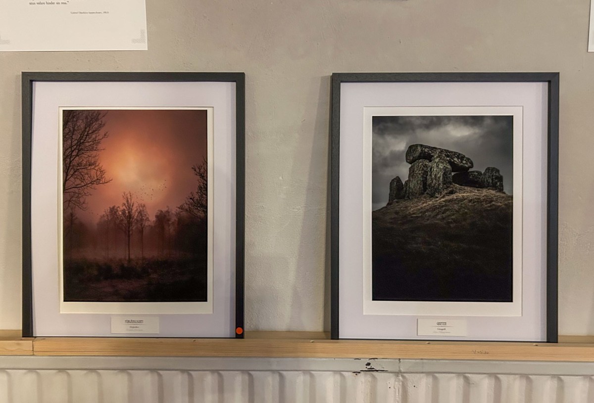 Här var det en utställning av Nicklas Sjölund Larssons foton. Vi har tidigare följt honom på Instagram där han har kontot @ancient_sites. Den här utställningen har fått namnet ”Bilder av ett gåtfullt förflutet”. Han fotograferar just ”ancient sites” vilket är platser med rester från forntida och historiska perioder, som runstenar, gravplatser, gruvor, torp och andra kulturlämningar. Då kan vi bara konstatera att han hamnat på rätt plats då Falbygden verkligen kryllar av sådana platser. Det sägs t ex att 75% av Sveriges megalitgravar finns här på Falbygden.