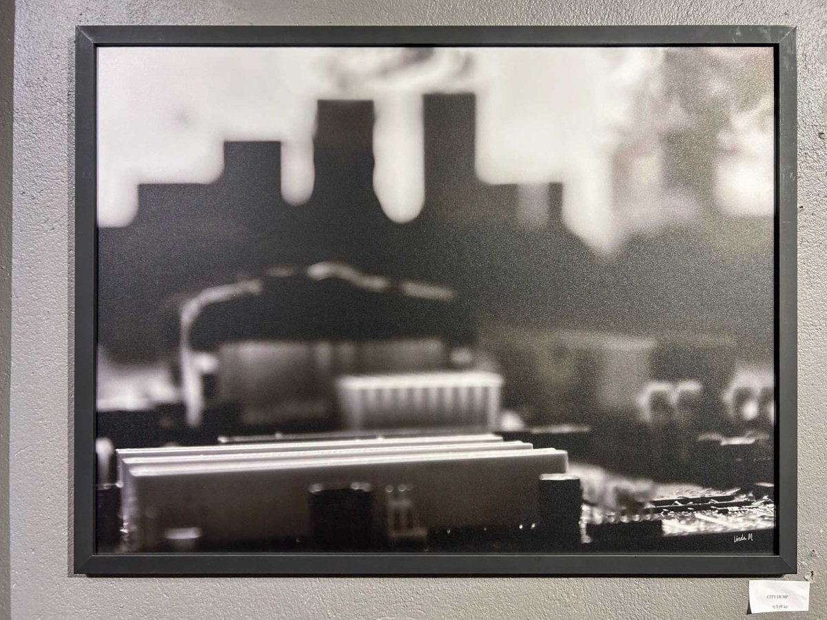 I ett konferensrum där ställde Linda Magnusson, medlem i vår fotoklubb ut. Vi fick en trevlig pratstund med henne och så fick vi se hennes otroliga bildserie av en ”stad” i gråskala. Allt började när en dator skulle skrotas 2019. När hon plockat isär den tyckte hon komponenterna och kretskorten såg ut som en stad och honbörjade fotografera dem. Vi tycker hennes tankar och foton är otroligt kreativa och häftiga!