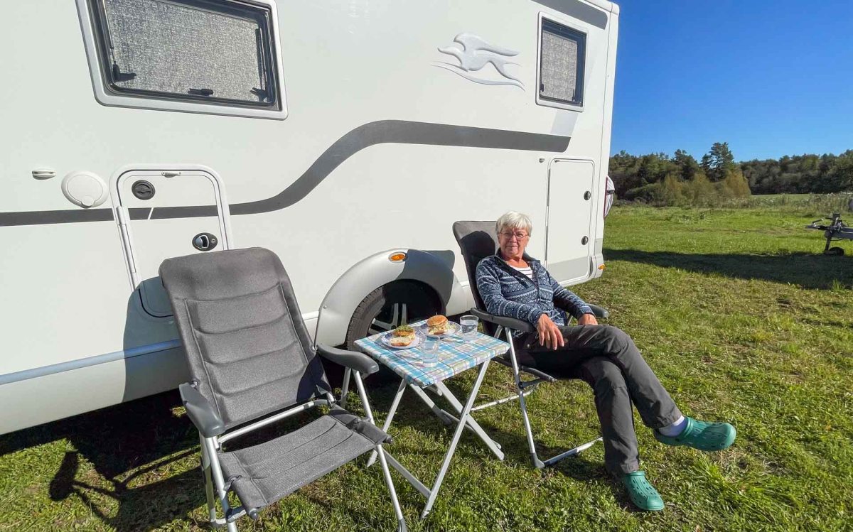 Medan Lars gick lös med såg, skruvdragare och häftpistol började B-M plocka i skåpen inne i husbilen. Många onödiga saker rensades ut och fler ska det bli innan vi drar söderut. Tänk att vi den 26 september kunde njuta av en lunchhamburgare ute i solen, med utsikt över åker och äng. Tröjan åkte av och det blev en powernap innan arbetet återupptogs.
