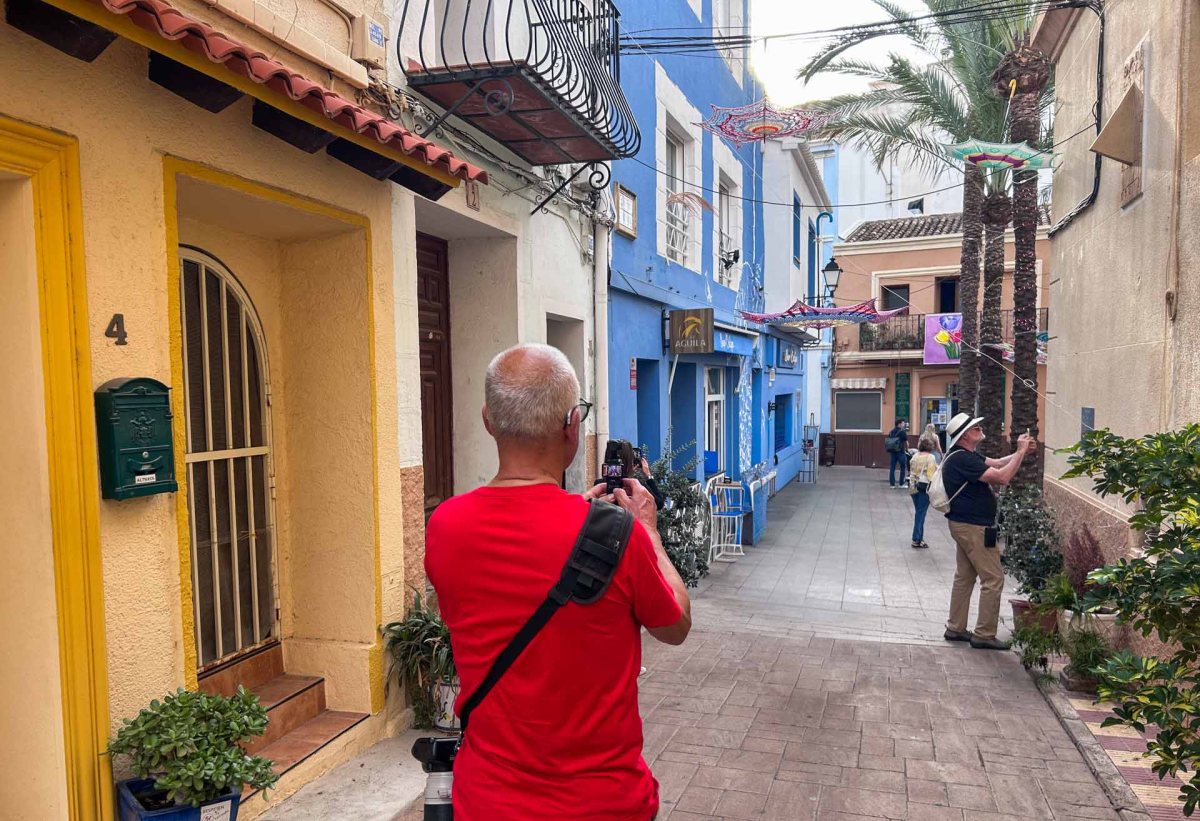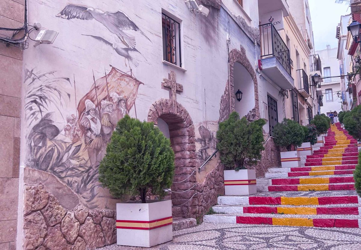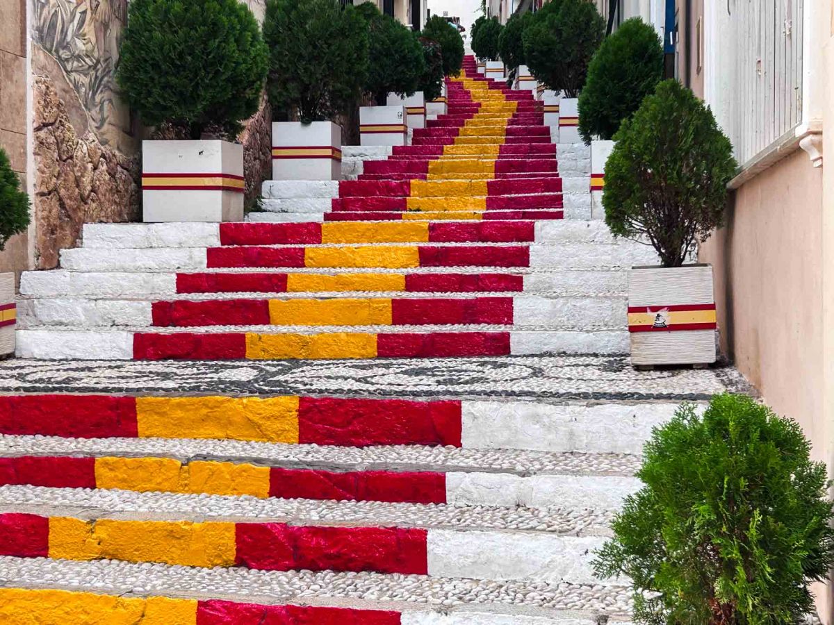Vi bestämmer oss för att ta en promenad fram till centrum och som vårt första mål har vi Calle Puchalt, som, förutom Calpeklippan, är en av de mest fotograferade platserna i staden och självklart vill vi dit då. Vägen dit kan vi väl säga gick uppåt, uppåt och så ännu lite mera uppåt. Anledningen till populariteten är den färgglada trappan. Den byggdes på 70-talet eftersom gatan var så brant och i början på 80-talet målades sättstegen så att trappan nu ser ut som en lång spansk flagga.