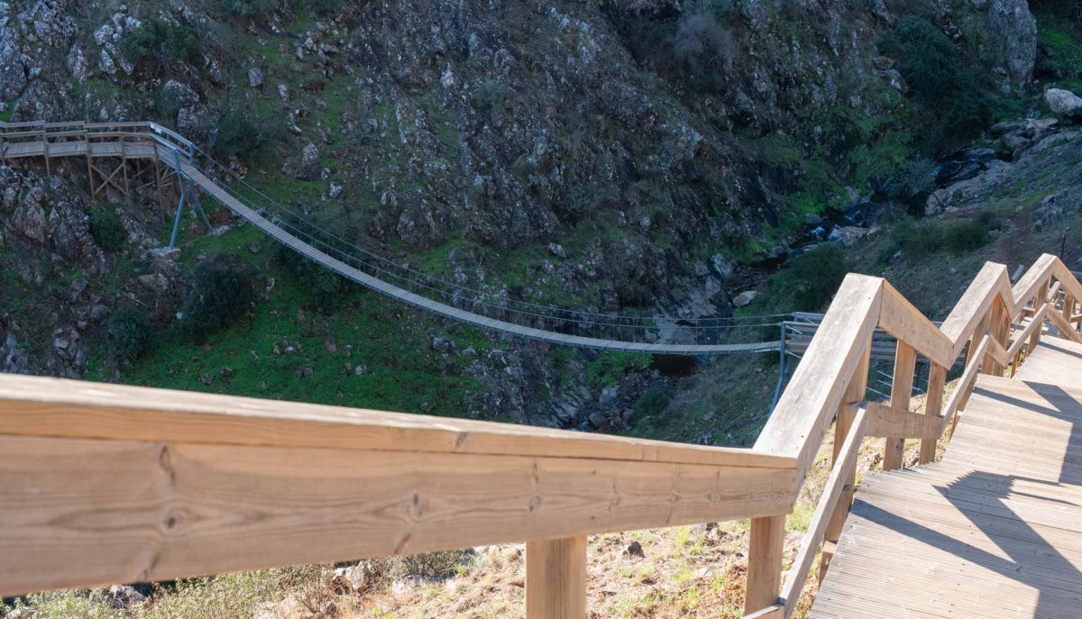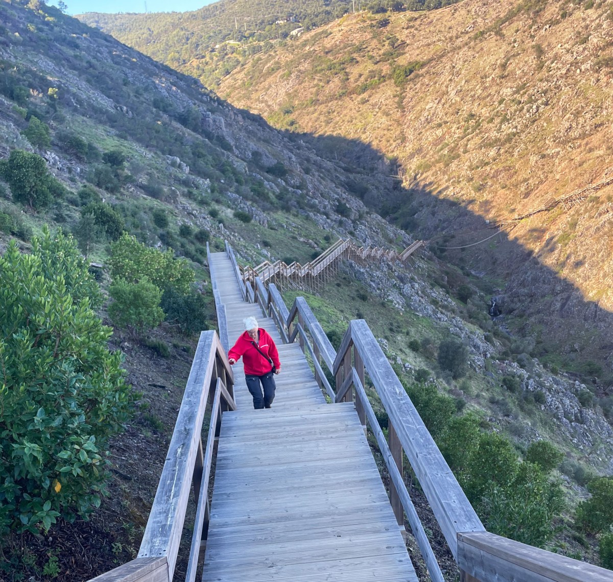 Den här ”boardwalken”, som invigdes i oktober 2023 är verkligen ett gediget snickeriarbete. Först bär trapporna neråt mot den ca 50 meter långa hängbron över ravinen Baranco do Demo.