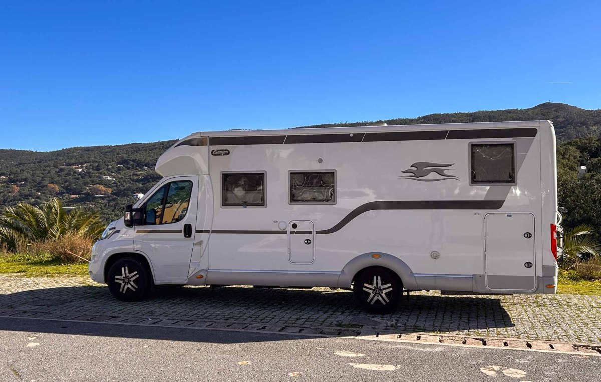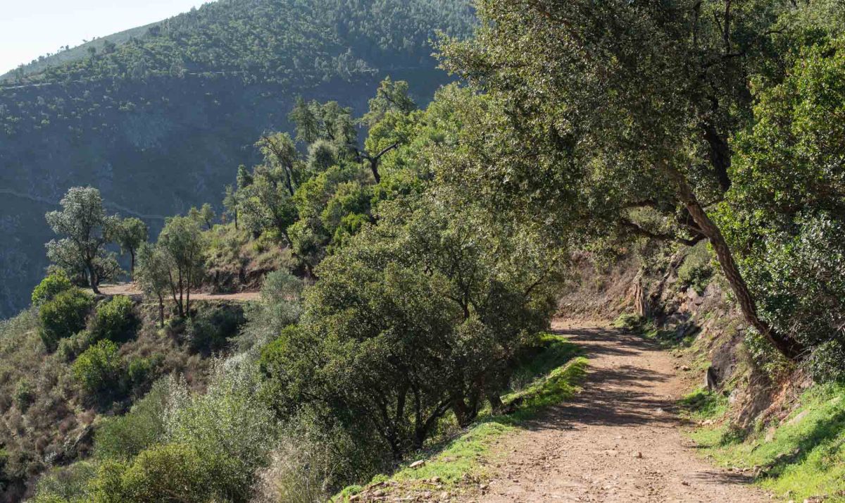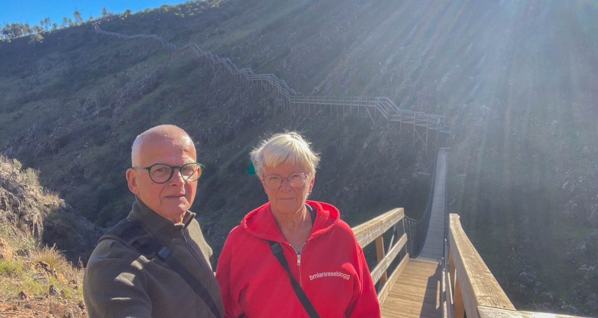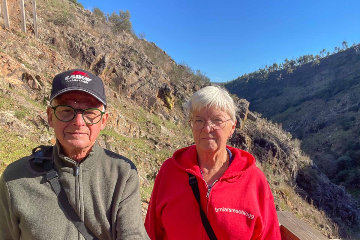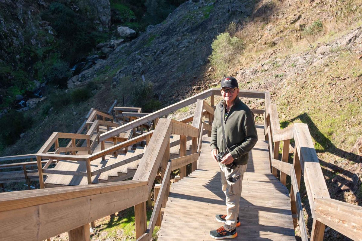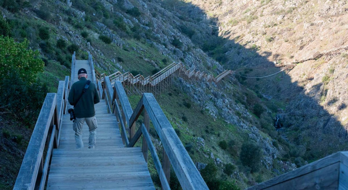 En riktigt mysig stad är det men nu känns det att vi kommit högre upp i bergen för dagens kraftiga vindar känns riktigt kalla och nästan så vi skulle behöva ett par tunna vantar. Inte långt härifrån ligger Fóia. Algarves högsta topp med sina 902 m ö h, men denna kalla blåsiga dag känns det inte alls lockande att åka dit. Istället åker vi mot den lilla byn Alferce, en knapp mil från Monchique. Här finns en nästan ny ställplats och en s k ”boardwalk”, en iordningställd vandringsled med trappor, träspångar och en hängbro i en ravin med magiskt vackra omgivningar. Detta är ett resultat av ett EU-projekt för att utveckla landsbygds- och ekoturismen. På små trånga gator kommer vi till ställplatsen. Här finns ett 40-tal, rejält tilltagna, platser på grus. Det finns tömningsmöjligheter och färskvatten, men ej el. Dessutom är det gratis att övernatta här.