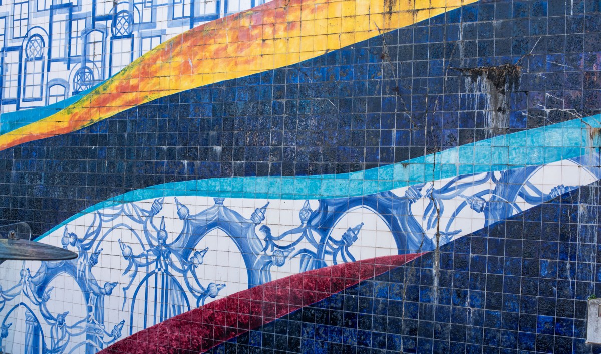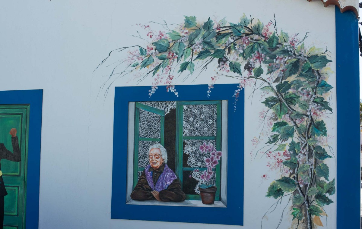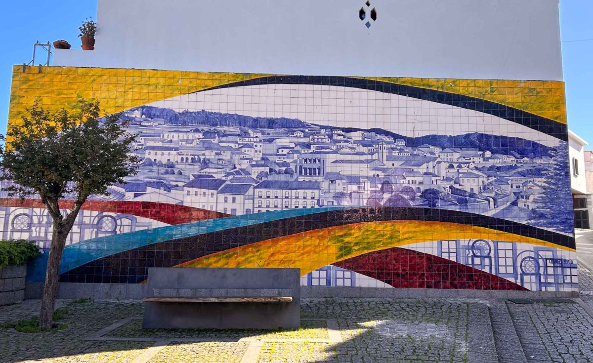 Här finns också ett par vackra kakelväggar. När vi gått uppför den rejäla backe vi måste ta för att komma ur staden (trafiken i centrum är enkelriktad) möts vi av en kakelvägg där motivet är en vy över Monchique.