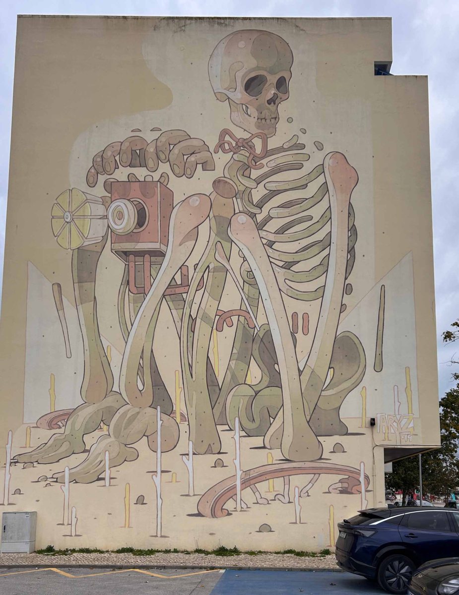 Det hade gått att fortsätta på spångar längs med kusten men vi vände efter en bit då vi också tänkte åka in till Lagos och strosa runt där denna eftermiddag. Vi hade hittat en bra parkering för husbilar i Park4Night eftersom de flesta gatorna i städerna här inte är direkt lämpade för större fordon. Där möttes vi av en stor, men inte direkt vacker muralmålning.