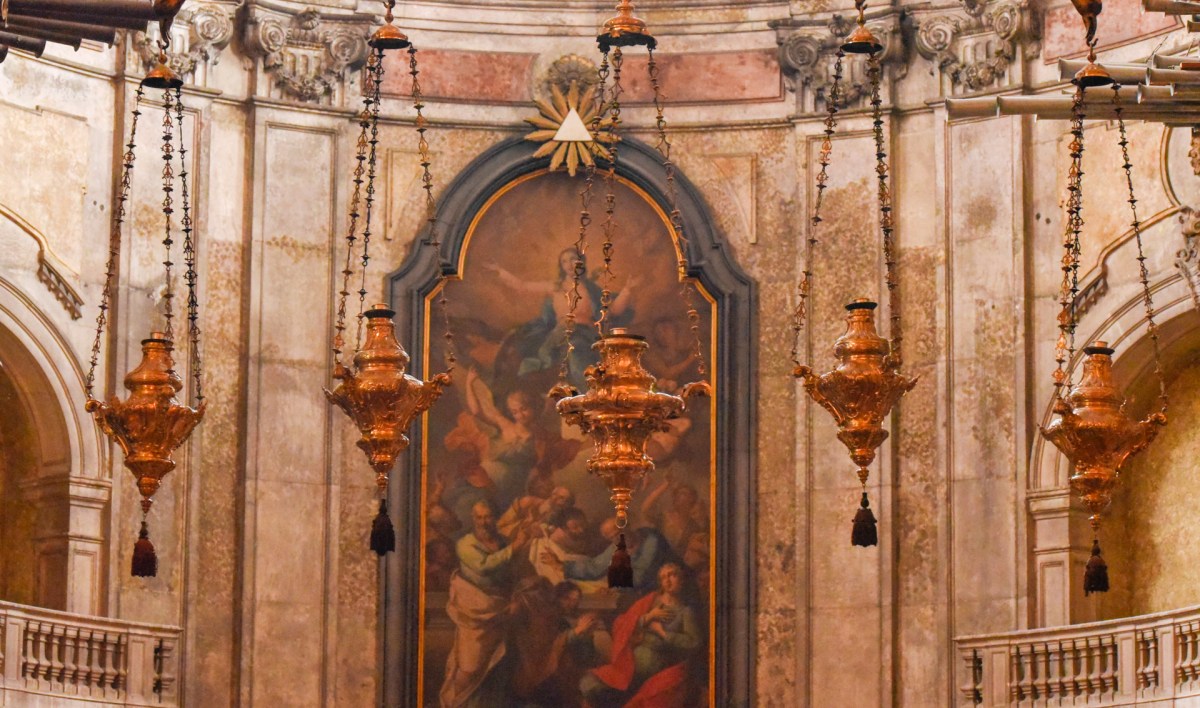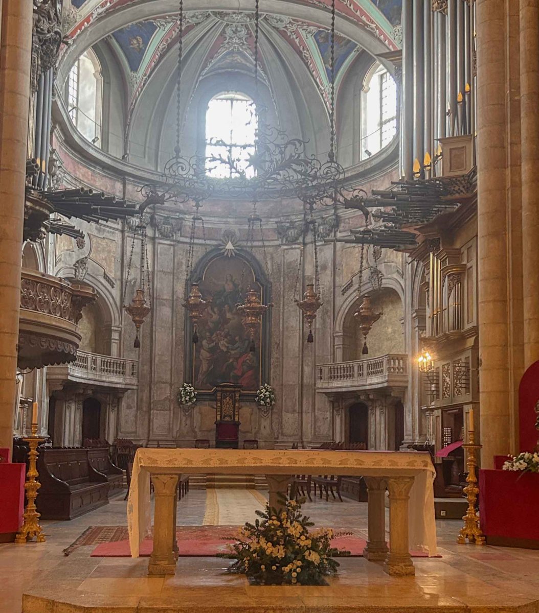 Vi går fram i kyrkan och det fina koret där de vackra rökelsekaren hänger i taket.