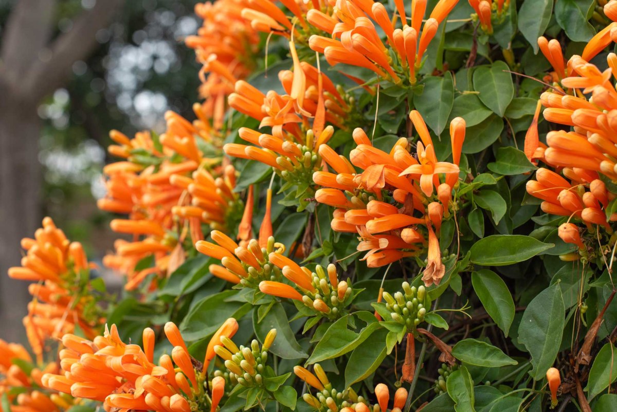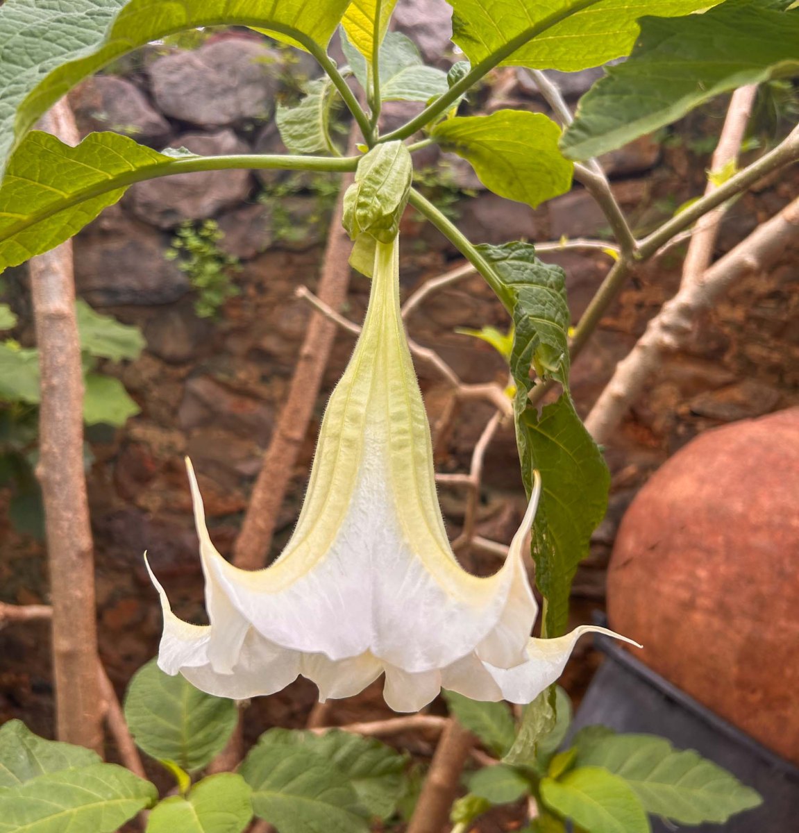 Här uppe finns också en vacker trädgård, där våra julstjärnor står i full blom som stora träd. Här blommar också rosor, änglatrumpeter, bougainvillea och en häck med för oss okända orange blommor som stod i knopp. När vi undersökte den närmare ska den troligen heta flamranka.